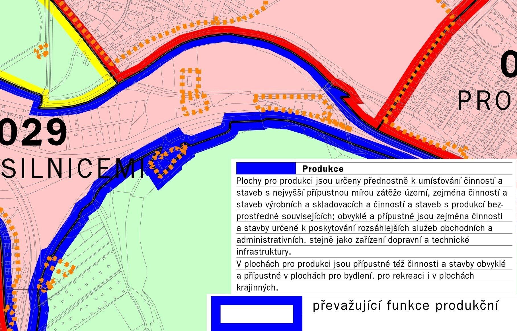Územní plán - plochy produkce: určeny přednostně k umísťování činností a staveb s nejvyšší mírou zátěže území, zejména činností a staveb výrobních a skladovacích a činností, k poskytování rozsáhlejších služeb obchodních a administrativních, stejně jako zařízení dopravní a technické infrastruktury.