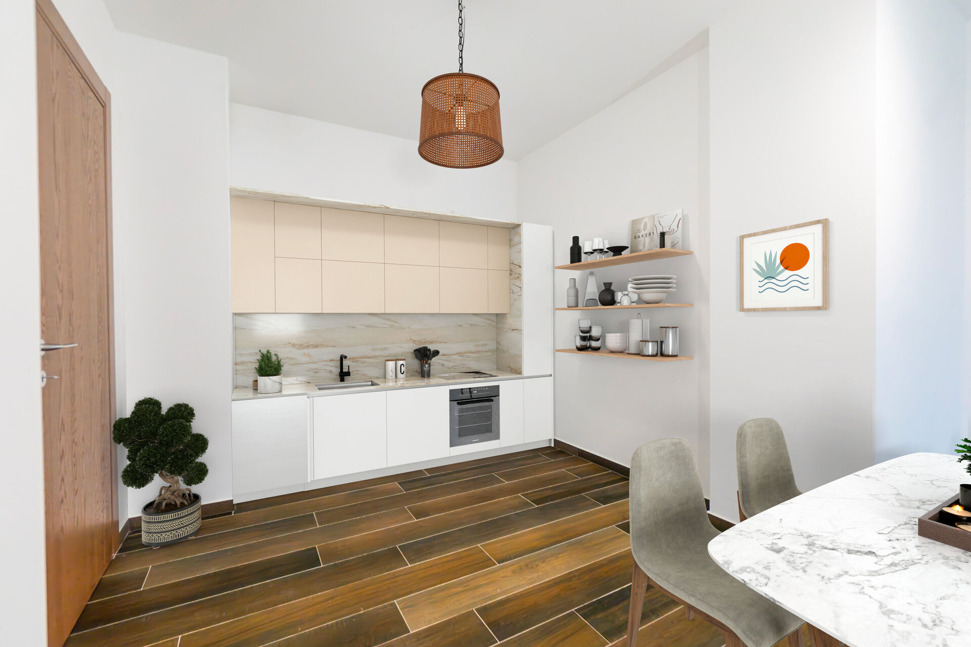 Vnitřní řešení bytových jednotek odpovídá moderním trendům v bydlení. Propojení obývací části s kuchyňskou nabízí větší variabilitu prostor a možnost uplatnit originální řešení. Výsledný otevřený prostor je působivý, vzdušný a jednotliví členové rodiny tak mohou být stále pohromadě.