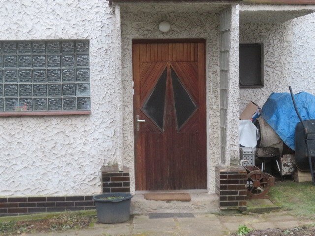 dřevěná dvojitá. Okna jsou opatřena parapety. Vchodové dveře domu jsou dřevěné částečně