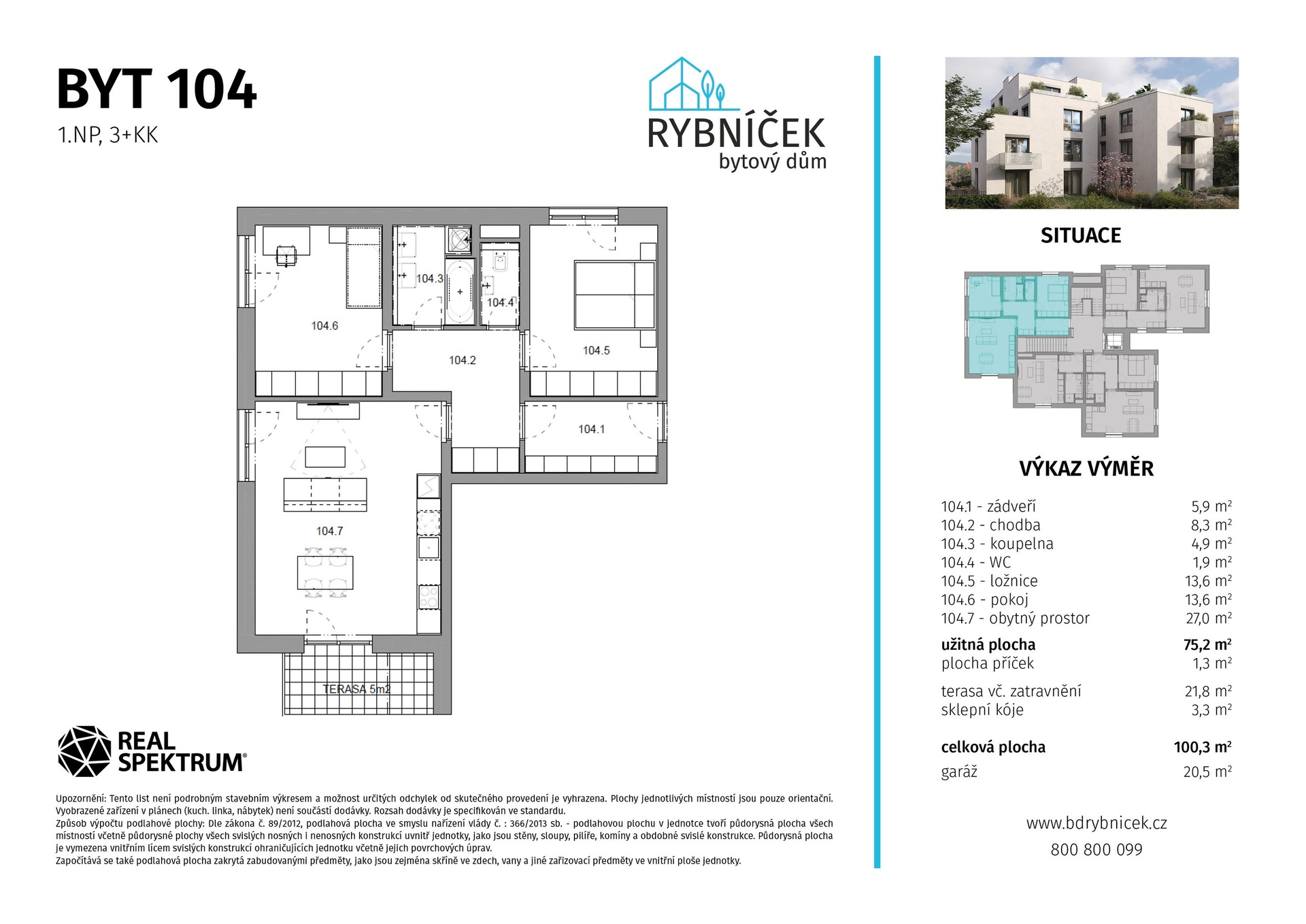 Ve výhradním zastoupení investora vám nabízíme moderní byt 3+kk s velkorysou terasou se zatravněním a vlastní garáží, který je součástí zcela nového čtyřpodlažního bytového domu v projektu Bytový dům Rybníček. K bytu dále náleží sklepní kóje, která poskytuje dostatek úložného prostoru.