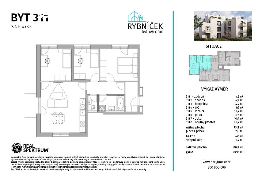 Ve výhradním zastoupení investora vám nabízíme moderní byt 4+kk s balkónem a vlastní garáží, který je součástí zcela nového čtyřpodlažního bytového domu v projektu Bytový dům Rybníček. Dispozičně velmi dobře řešený byt se vyznačuje dostatkem úložného prostoru. K bytu dále náleží prostorná sklepní kóje.