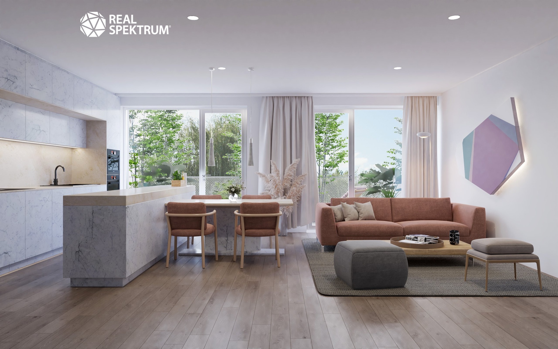 Tento prostorný byt vyniká nadstandardním vybavením a moderním designem, který kombinuje vzdušný interiér s důrazem na praktičnost. Celý projekt je pečlivě zasazen do okolí a nabízí klidné prostředí v harmonii se zelení, přitom však zůstává ideálně propojen s městským životem.
