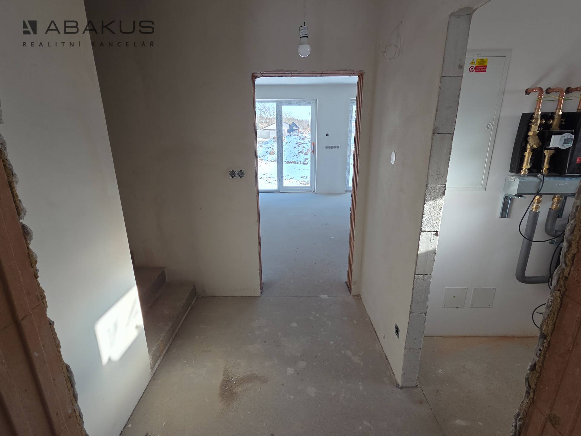 Přízemí: zádveří, chodba, technická místnost, koupelna + WC, sklad, obývací pokoj s kuchyňským koutem a možností instalace krbu, přímý vstup na zahradu, schodiště s úložným prostorem.