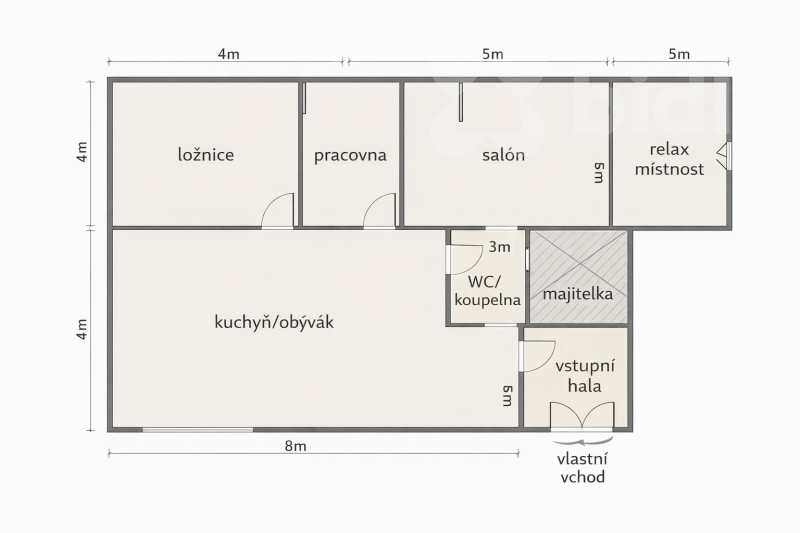 Popis vybavení:Dispozice prostoru nabízí obytnou kuchyň s obývací částí o velikosti 32 m² (8 × 4 m), která tvoří hlavní společenský prostor. Dále je k dispozici ložnice o velikosti 10 m² (4 × 2,5 m) a samo