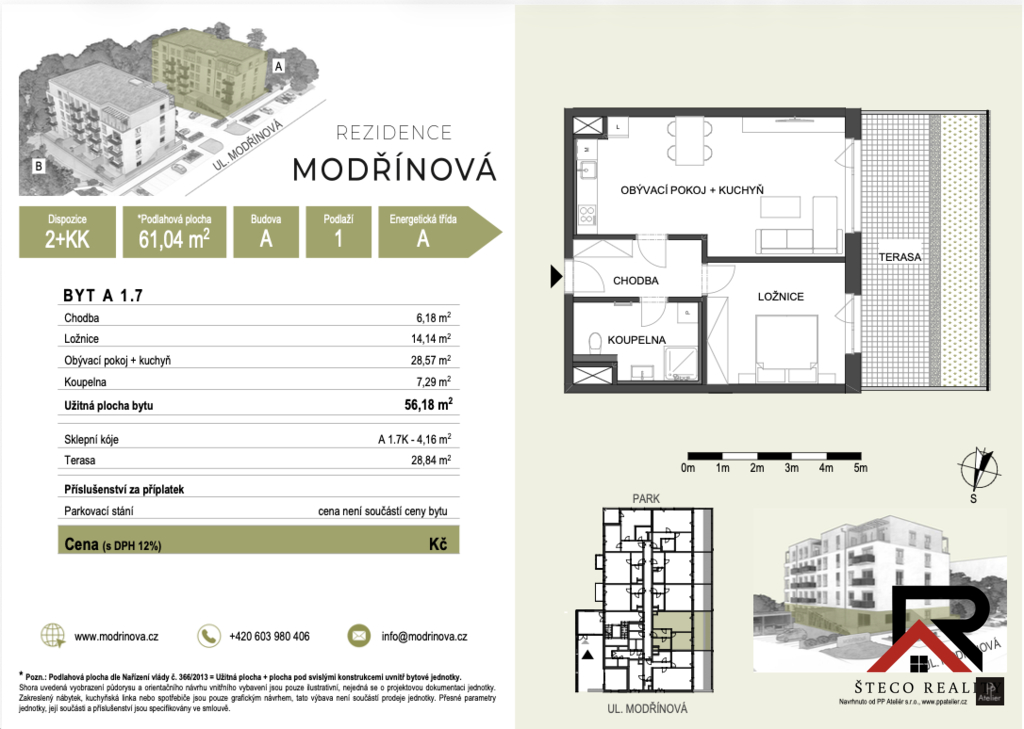 Nabízíme k prodeji byt v developerském projektu Rezidence Modřinová, nacházející se na ulici Modřínová v Třebíči. Tento projekt je novostavbou, která se dokončí v KVĚTNU 2026, což představuje jedinečnou investiční příležitost. Jedná se o moderní byt o dispozici 2 + kk, s plochou 61,04 m², umístěný v 1. nadzemním podlaží cihlového objektu. Projekt splňuje přísné normy moderní výstavby a pyšní se energetickým štítkem třídy A.