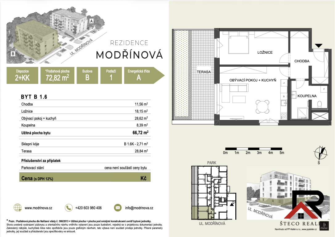 Nabízíme k prodeji byt v developerském projektu Rezidence Modřinová, nacházející se na ulici Modřínová v Třebíči. Tento projekt je novostavbou, která se dokončí v KVĚTNU 2026, což představuje jedinečnou investiční příležitost. Jedná se o moderní byt o dispozici 2 + kk, s plochou 72,82 m², umístěný v 1. nadzemním podlaží cihlového objektu. Projekt splňuje přísné normy moderní výstavby a pyšní se energetickým štítkem třídy A.