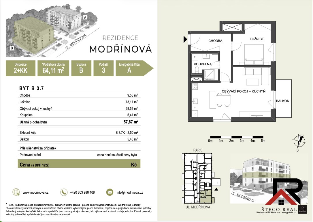 Nabízíme k prodeji byt v developerském projektu Rezidence Modřinová, nacházející se na ulici Modřínová v Třebíči. Tento projekt je novostavbou, která se dokončí v KVĚTNU 2026, což představuje jedinečnou investiční příležitost. Jedná se o moderní byt o dispozici 2 + kk, s plochou 64,11m², umístěný ve 3. nadzemním podlaží cihlového objektu. Projekt splňuje přísné normy moderní výstavby a pyšní se energetickým štítkem třídy A.