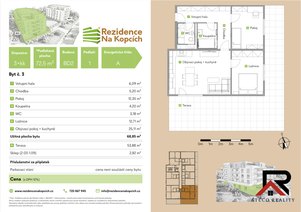 Nabízíme k prodeji moderní byt 3 + kk, nacházející se v klidné rezidenční lokalitě obklopené zelení na ulici Na Kopcích v obci Nové Město, okres Třebíč. Tento jednopodlažní byt je situován v prvním patře pětipodlažního panelového domu a jeho užitná plocha činí 68,85 m². Součástí bytu je krásná terasa o velikosti 53,88 m2.