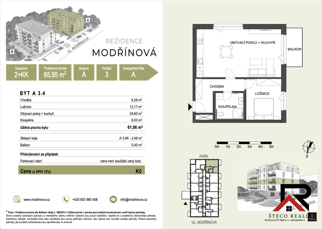 Nabízíme k pronájmu byt v developerském projektu Rezidence Modřinová, nacházející se na ulici Modřínová v Třebíči. Jedná se o nový moderní byt o dispozici 2 + kk, s plochou 65,95 m², umístěný ve 3. nadzemním podlaží cihlového objektu. Projekt splňuje přísné normy moderní výstavby a pyšní se energetickým štítkem třídy A. Součástí bytu je nová kuchyňská linka značky Oresi. Zálohy za energie činí 3000,- Kč.