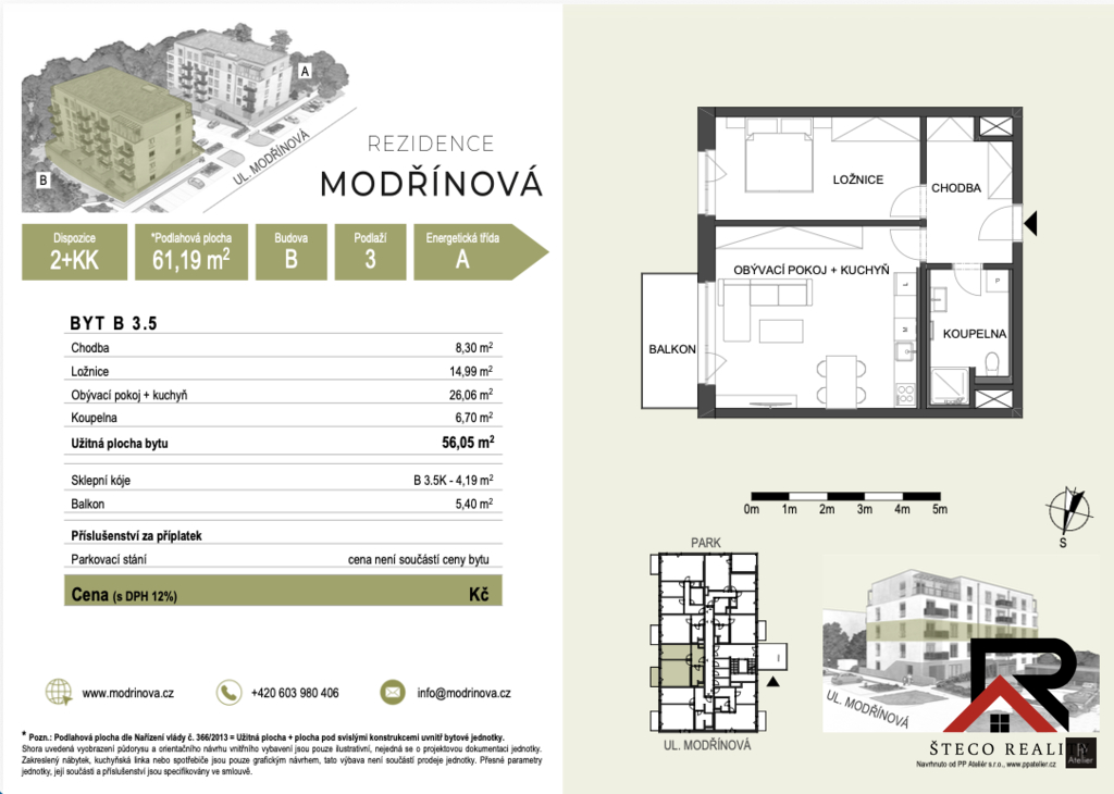 Nabízíme k pronájmu byt v developerském projektu Rezidence Modřinová, nacházející se na ulici Modřínová v Třebíči. Jedná se o nový moderní byt o dispozici 2 + kk, s plochou 61,19 m², umístěný ve 3. nadzemním podlaží cihlového objektu. Projekt splňuje přísné normy moderní výstavby a pyšní se energetickým štítkem třídy A. Součástí bytu je nová kuchyňská linka značky Oresi. Zálohy za energie činí 3000,- Kč.
