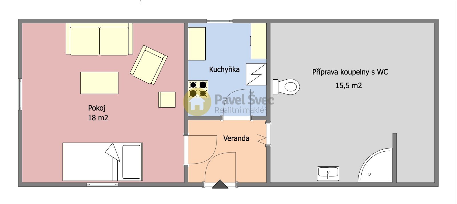 V obytné části je ústřední místnost, kuchyňka a místnost s přípravou koupelny.