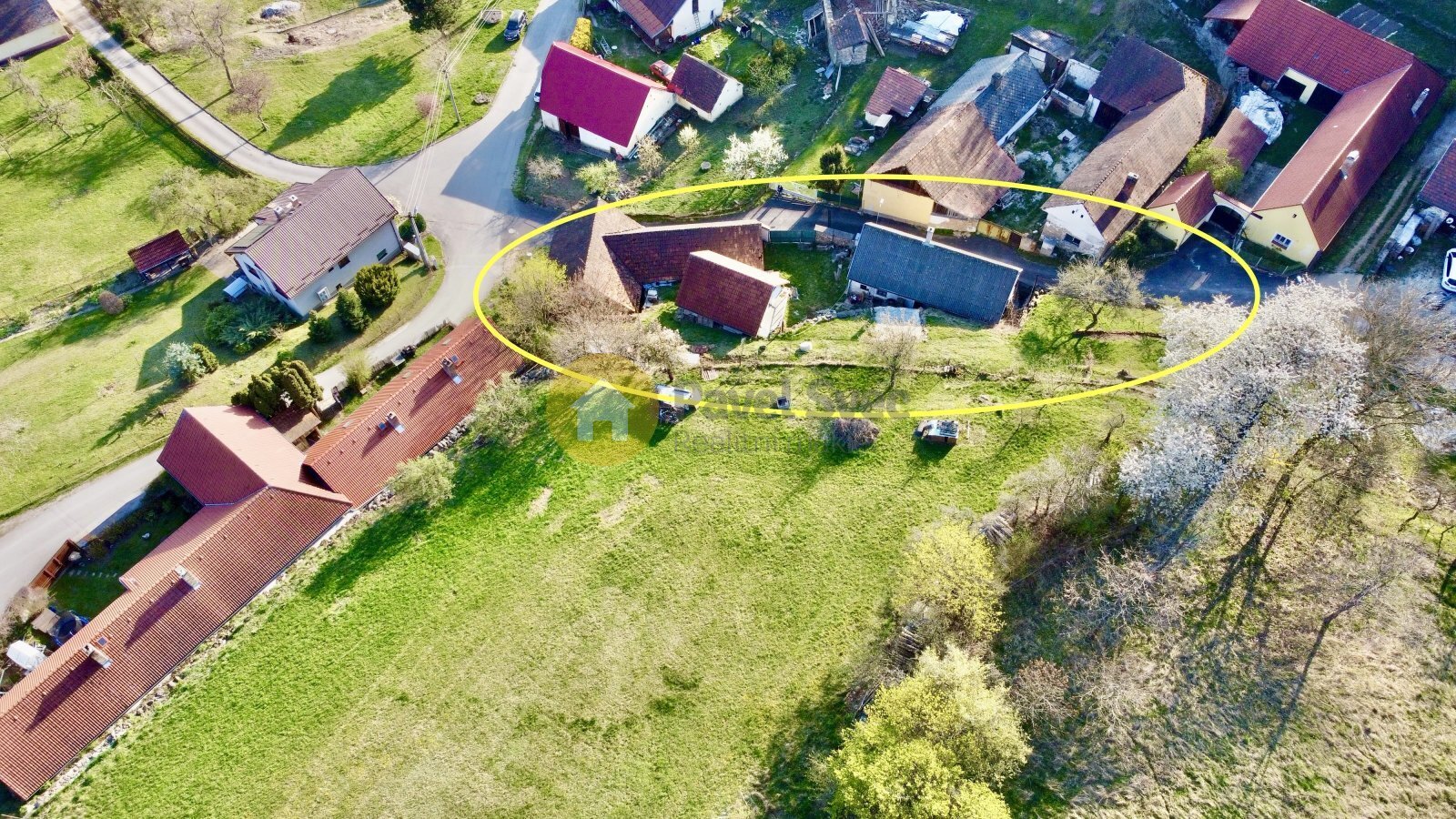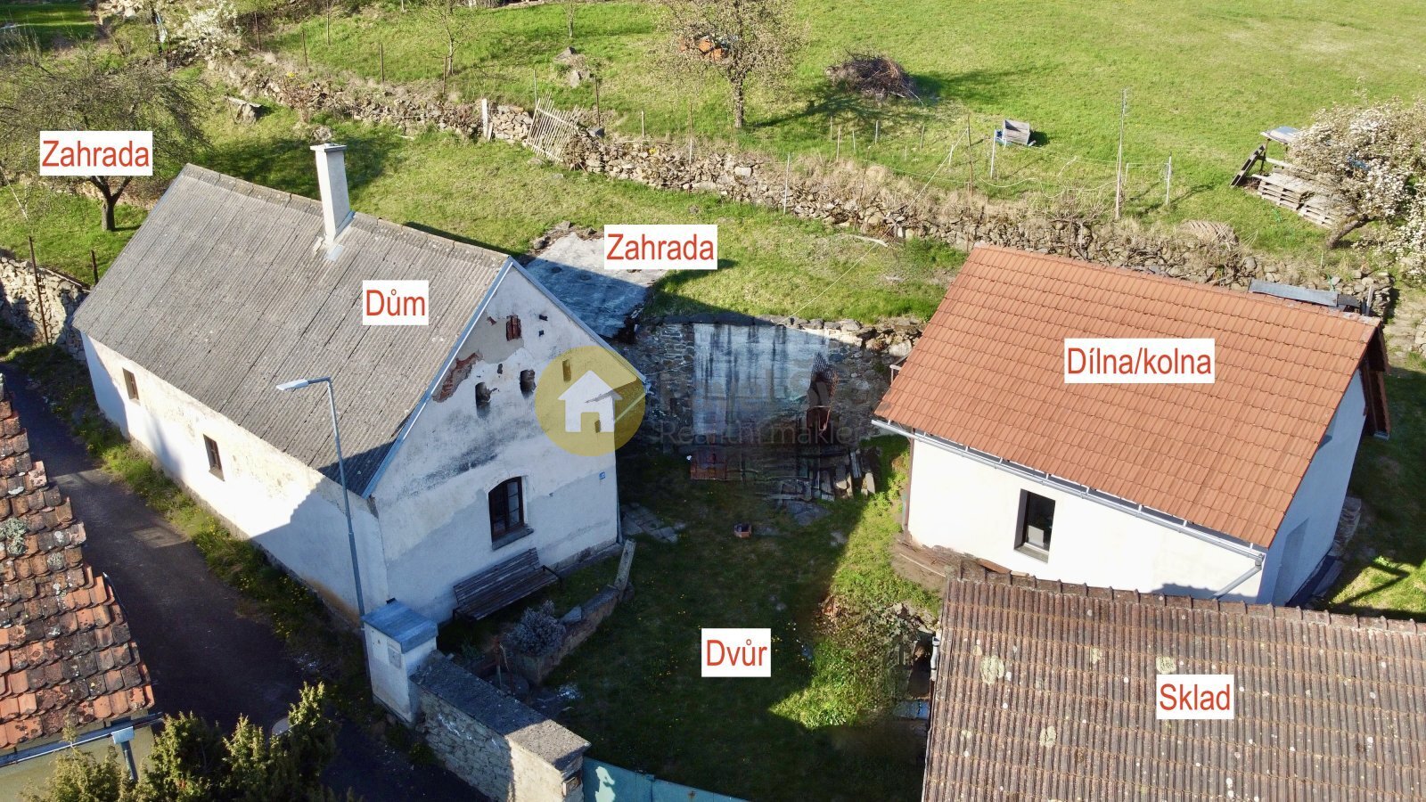 Uzavřený dvůr obklopen stavbami obytného domu, dílny, skladu, stodoly a nad domem zahrada 768 m2.
