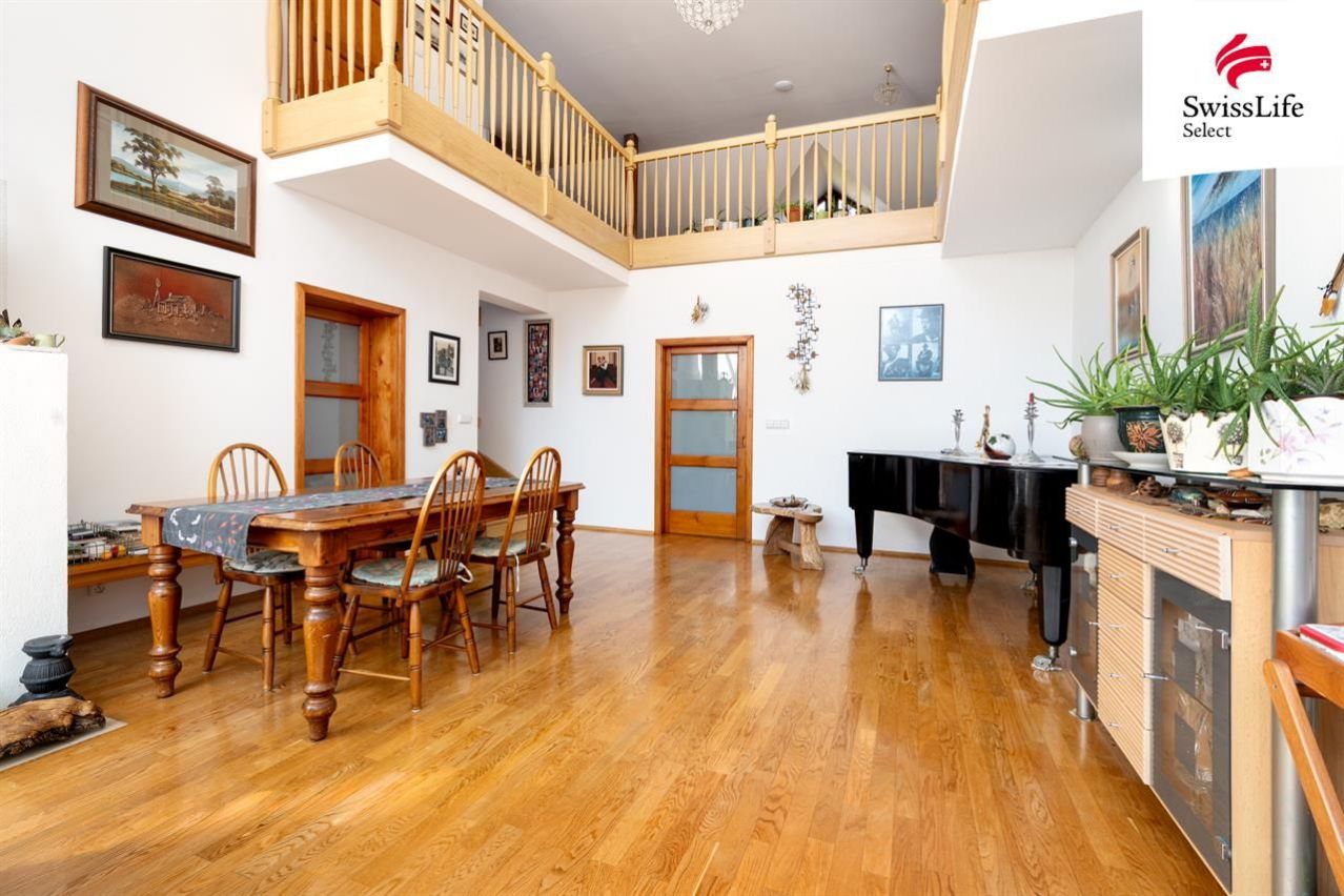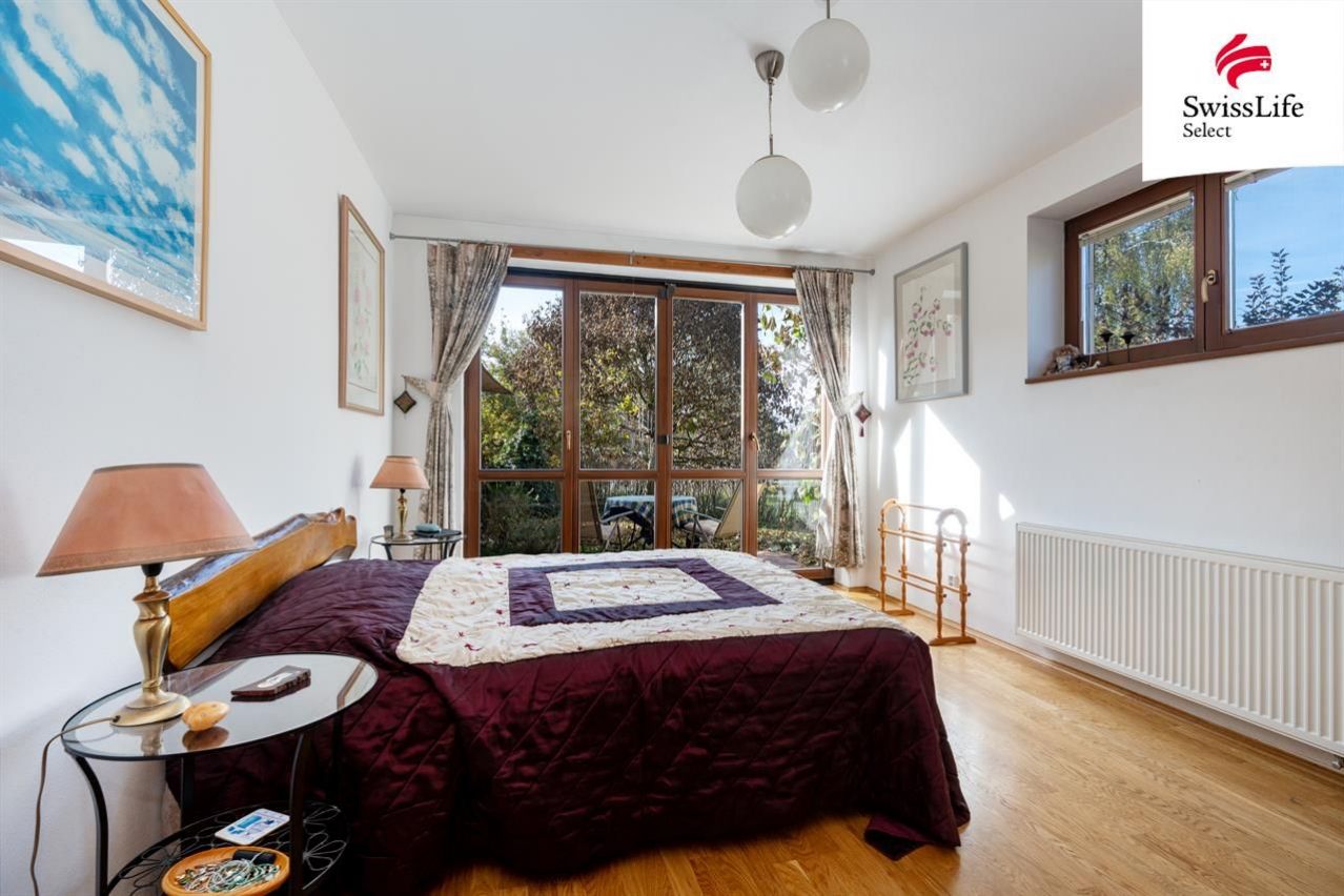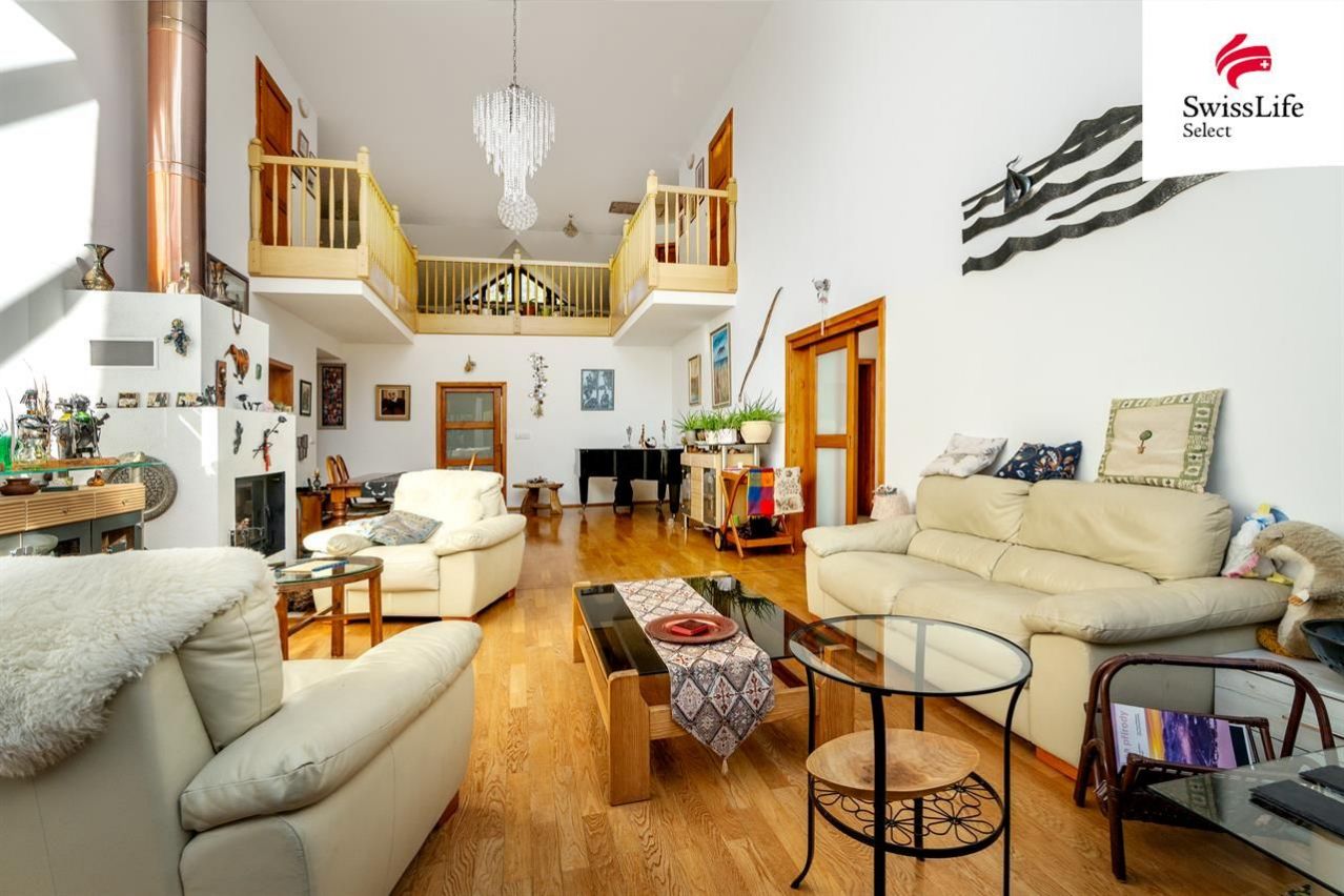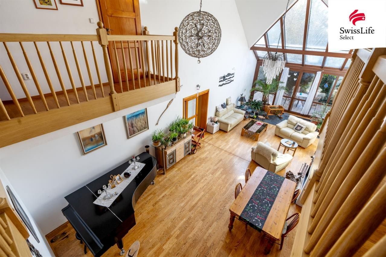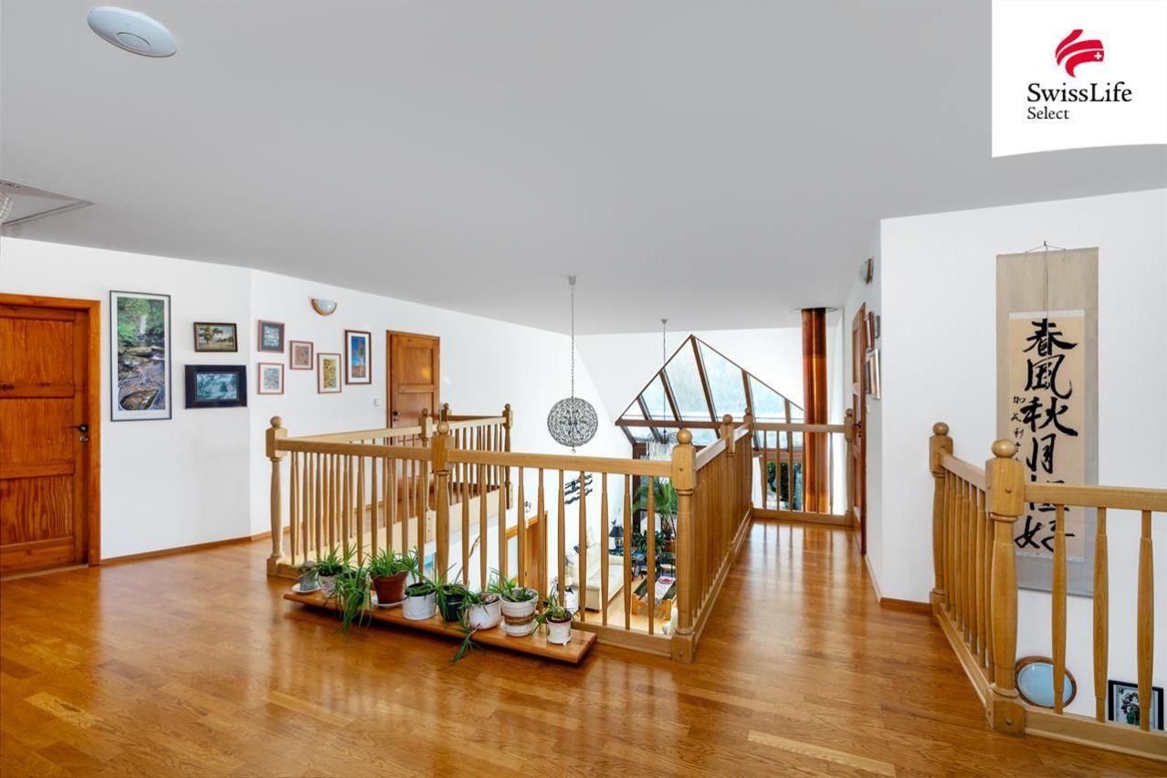Uvnitř domu vás přivítá příjemná atmosféra, promyšlený interiér a více než dostatek přirozeného světla. Celé přízemí je kompletně bezbariérové, wheel accessibl. Dispozice navržená ing. arch. Milanem Šindlerem zahrnuje prostorný centrální obývací pokoj s částečně proskleným stropem a s francouzským oknem vedoucím na zastíněnou terasu, kuchyň se spíží, s linkou z masivu a s venkovním posezením pro dva, dále tři samostatné ložnice s koupelnami, tři pokoje (hudebna, pracovna, technická místnost) a v neposlední řadě vnitřní verandu nad obývacím pokojem proměněnou ve studovnu a čítárnu ideální místo pro chvíle ticha, vůni knih a klidné večery. V domě se dále ještě nachází velká vstupní hala, šatna, čtvrtá koupelna (s pračkou, sprchovým koutem a toaletou) a další samostatná toaleta vedle pracovny. Co nemohu ve svém výčtu opomenout, je krásná sauna v prvním patře, vedle které je k dispozici sprchový kout. Půda domu je připravena pro vestavbu a tedy získání dalších prostorů k bydlení.