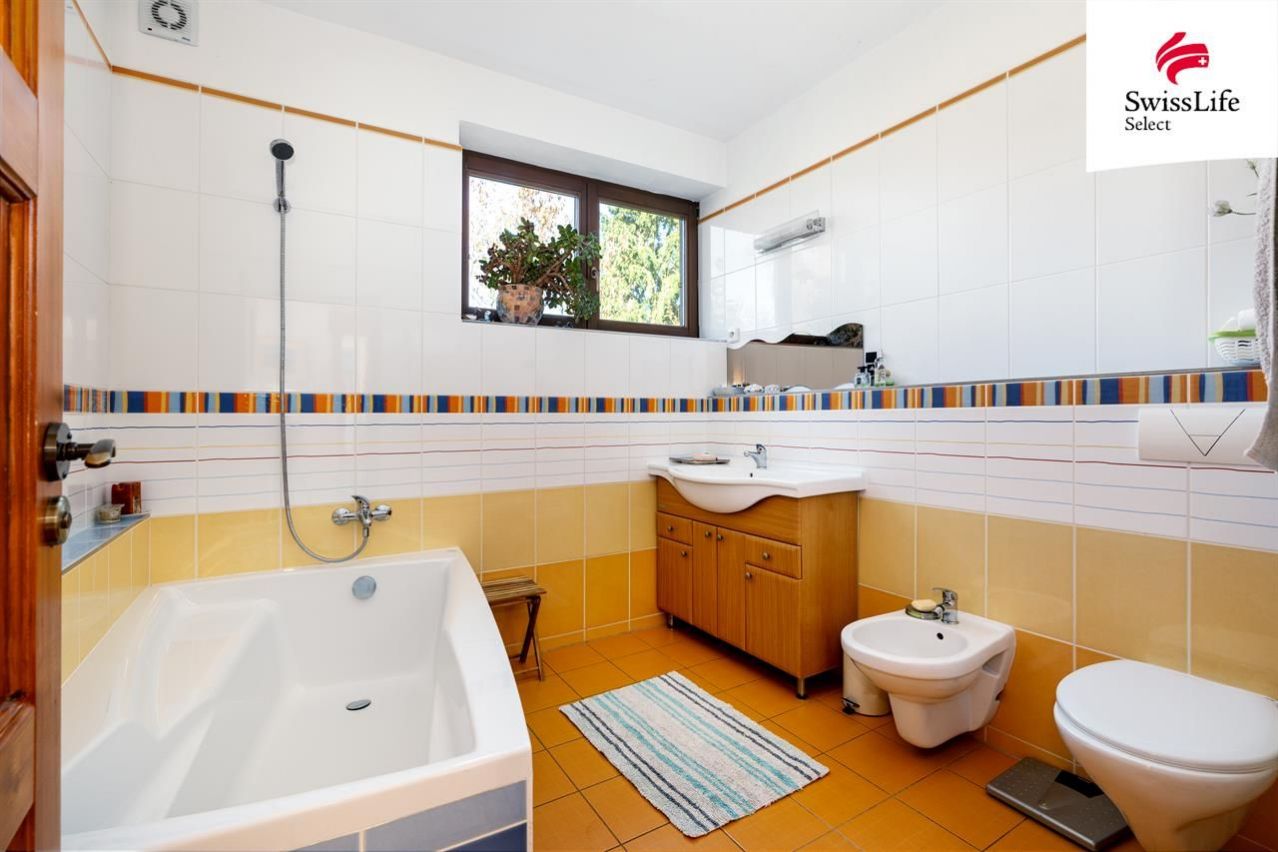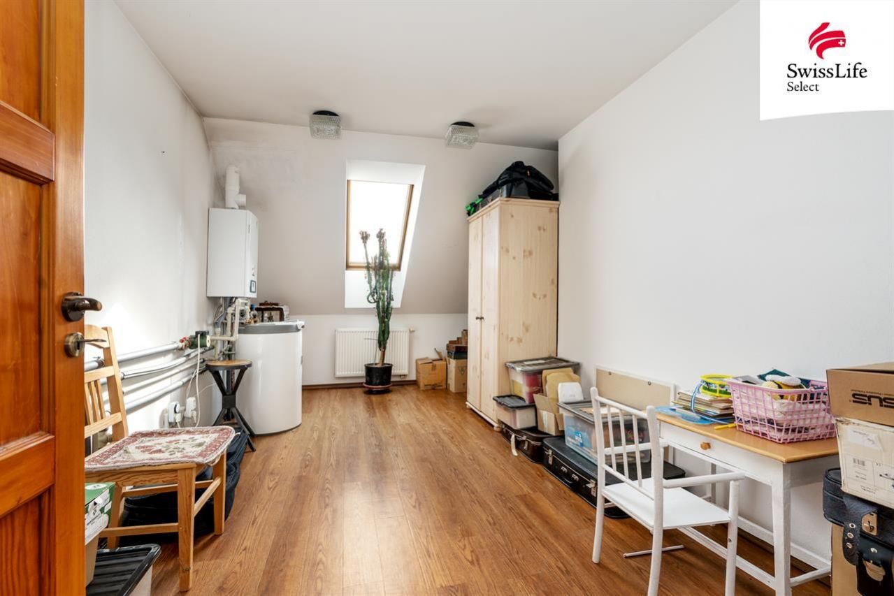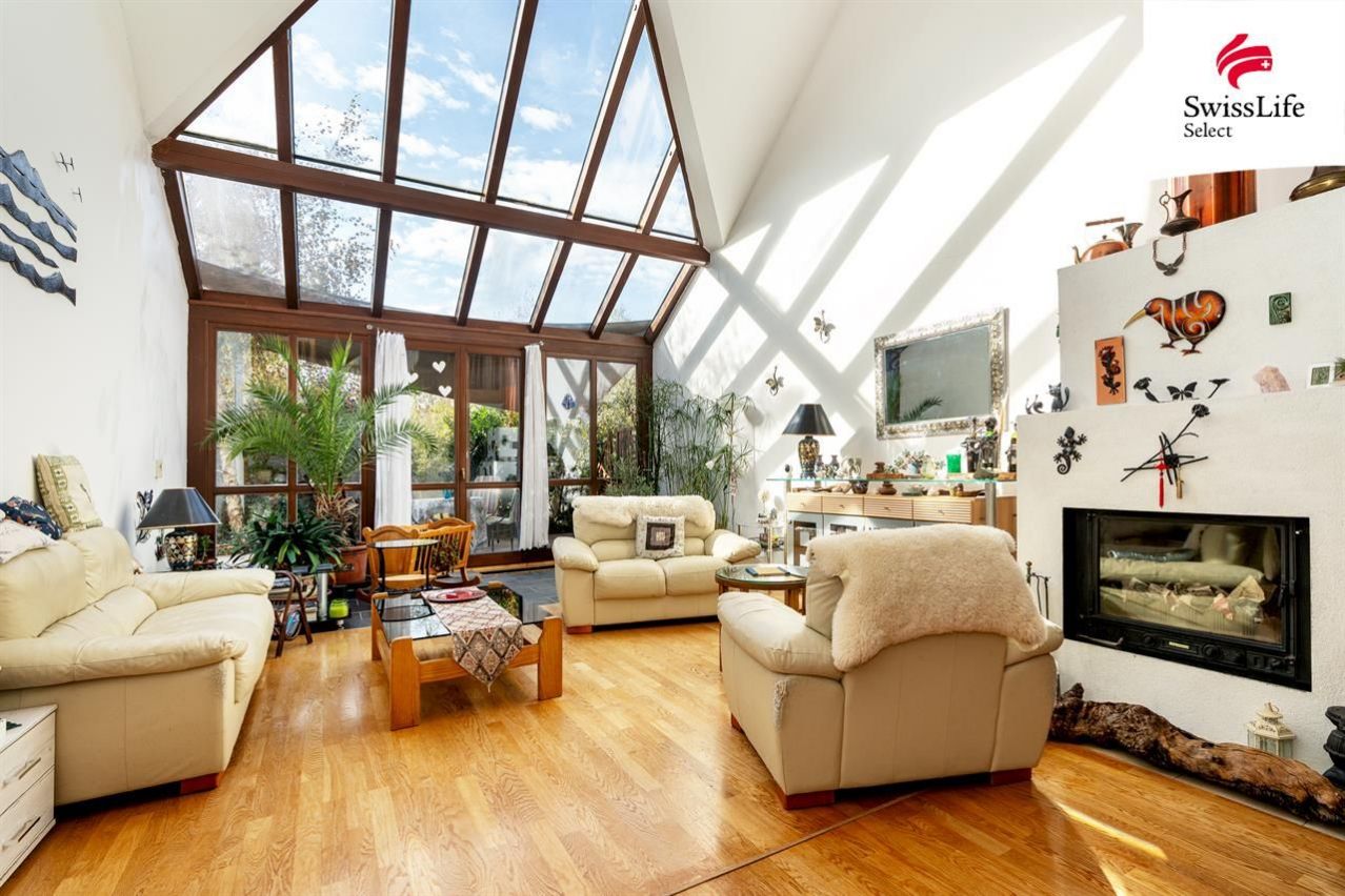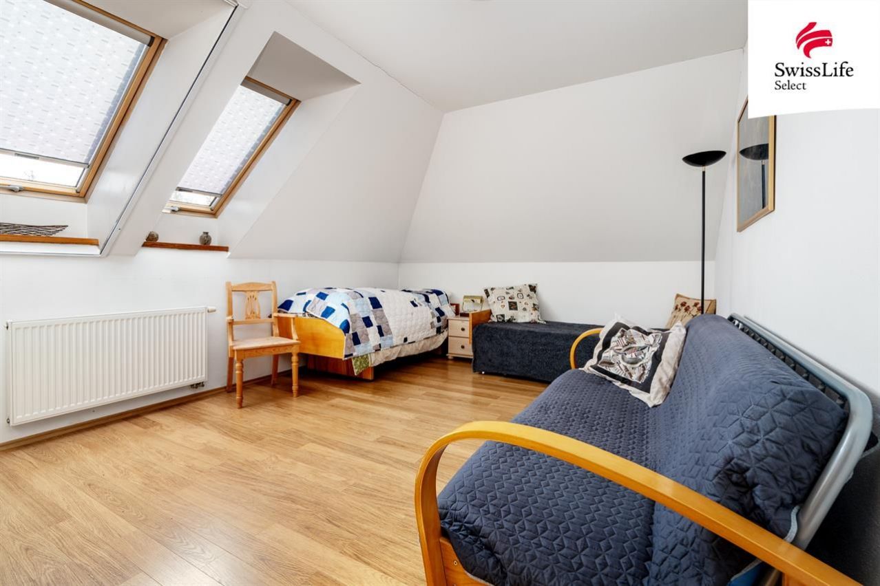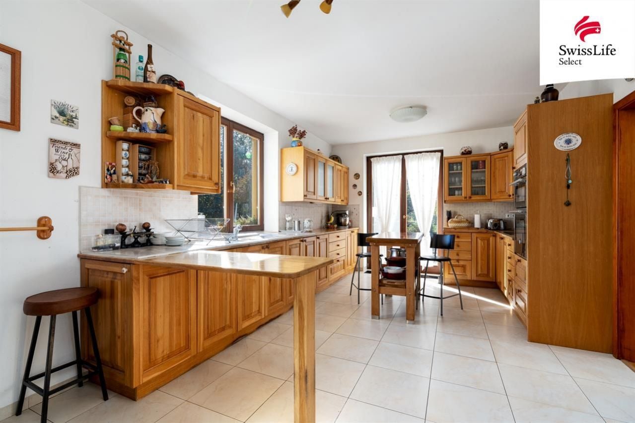 Uvnitř domu vás přivítá příjemná atmosféra, promyšlený interiér a více než dostatek přirozeného světla. Celé přízemí je kompletně bezbariérové, wheel accessibl. Dispozice navržená ing. arch. Milanem Šindlerem zahrnuje prostorný centrální obývací pokoj s částečně proskleným stropem a s francouzským oknem vedoucím na zastíněnou terasu, kuchyň se spíží, s linkou z masivu a s venkovním posezením pro dva, dále tři samostatné ložnice s koupelnami, tři pokoje (hudebna, pracovna, technická místnost) a v neposlední řadě vnitřní verandu nad obývacím pokojem proměněnou ve studovnu a čítárnu ideální místo pro chvíle ticha, vůni knih a klidné večery. V domě se dále ještě nachází velká vstupní hala, šatna, čtvrtá koupelna (s pračkou, sprchovým koutem a toaletou) a další samostatná toaleta vedle pracovny. Co nemohu ve svém výčtu opomenout, je krásná sauna v prvním patře, vedle které je k dispozici sprchový kout. Půda domu je připravena pro vestavbu a tedy získání dalších prostorů k bydlení.