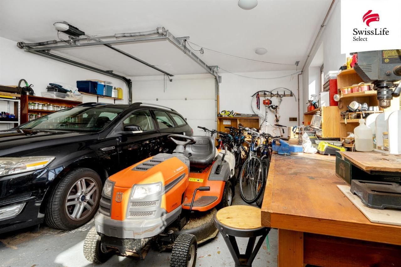Garáž s přímým vstupem do interiéru je také vytápěná a nabízí stání pro automobil, zahradní techniku, i tři masivní pracovní stoly a dostatek prostoru pro vaše tvoření.