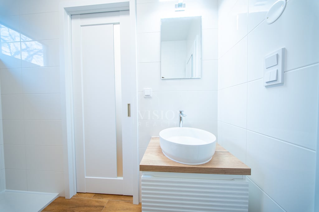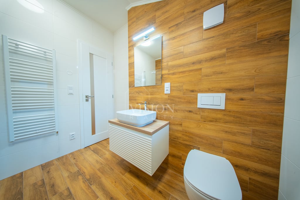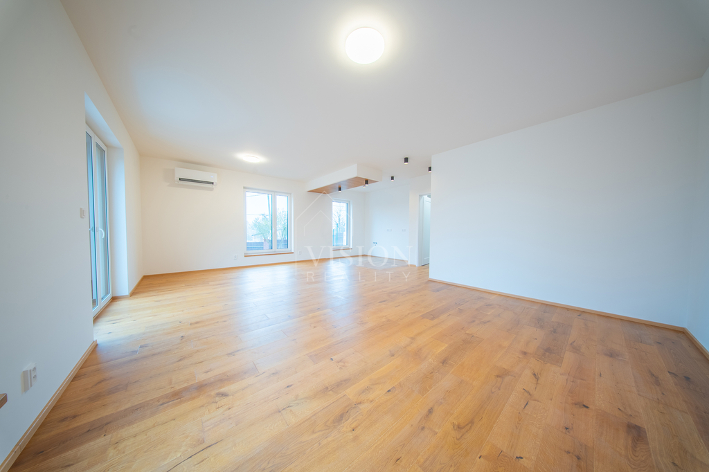 O špičkový komfort i minimální náklady se stará tepelné čerpadlo vzduch–voda napojené na podlahové vytápění v celém domě. Každá obytná místnost je navíc vybavena chytrou klimatizací ovládanou přes Wi-Fi, která umí chladit i topit. Právě dotápění klimatizací v jarních a podzimních měsících dále snižuje výdaje za energie. Dům je napojen na obecní vodovod a kanalizaci, přičemž každá jednotka má svůj vlastní elektroměr i vodoměr. Na pozemku je dále připravena retenční nádrž na dešťovou vodu s přepadem, vyvedenou elektřinou i hadicí pro budoucí zahradní závlahu.