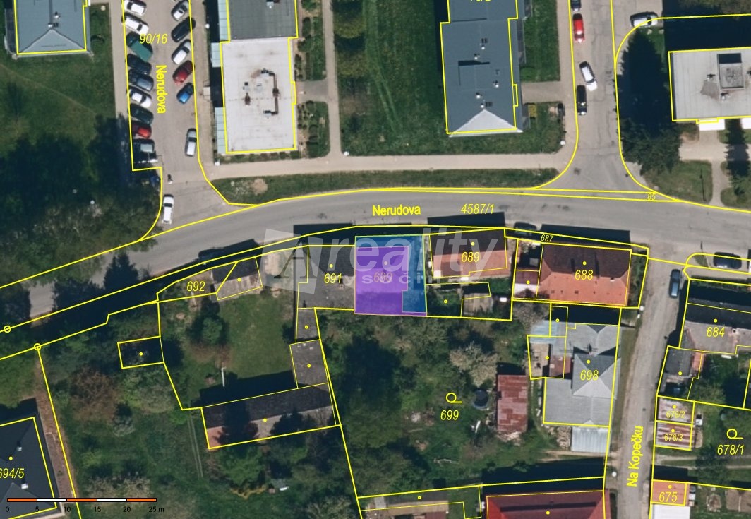 Dům ze tří stran lemuje vlastní pozemek včetně předzahrádky a průchozí kůlny. Pro Vaši stavbu tak můžete využít parcelu o výměře 153 m² přímo ve středu města.