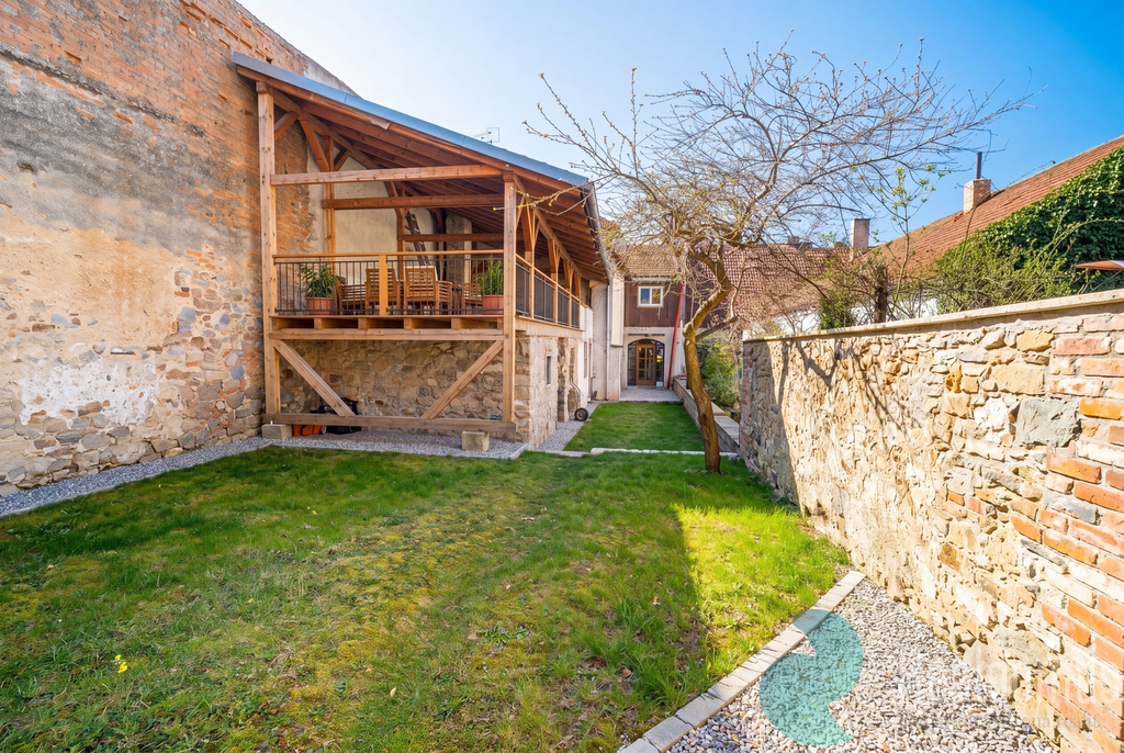 Na konci dvora je stodola, která umožňuje druhý vchod do nemovitosti, zároveň může být výzvou pro výstavbu dalšího domu nebo pouze prostor pro komfortní zastřešené parkování. Je zde i dostatek prostoru na zeleň a přizpůsobení exteriéru vlastním představám.