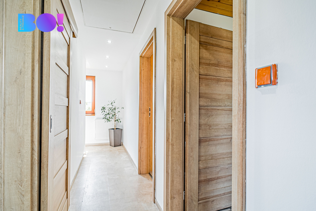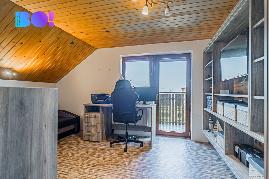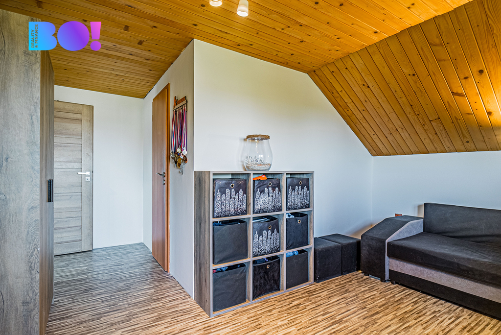 V patře najdete ložnici, dva dětské pokoje a prostornou koupelnu s vanou, sprchou i toaletou. Z chodby je výlez na pochozí půdu – ideální pro věci, které zrovna nepotřebujete, ale nechcete se jich vzdát. A celý dům je navíc podsklepený – další prostor pro dílnu, technické zázemí nebo klidně domácí posilovnu.