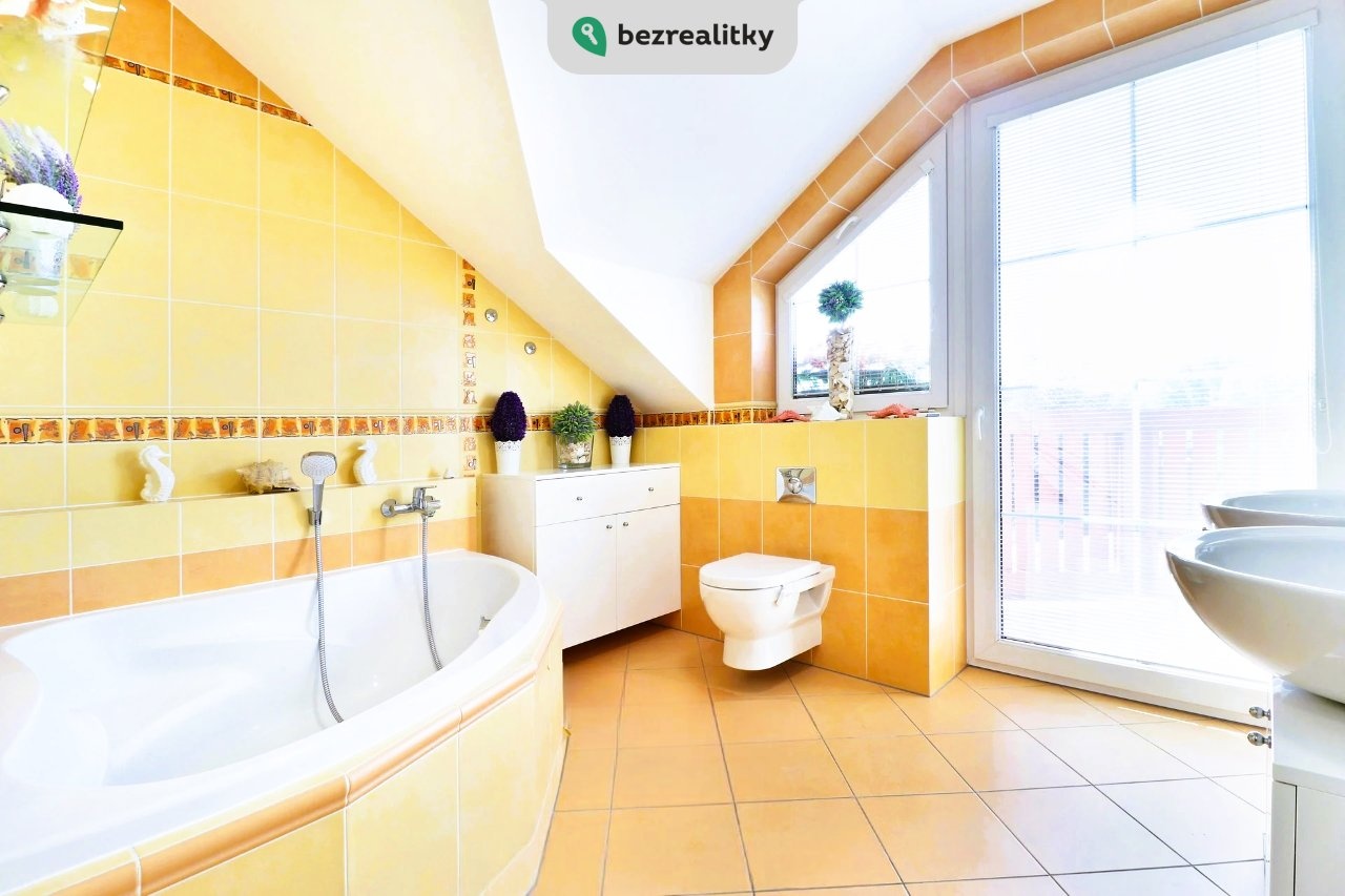 V patře: ložnice s balkonem a elektrickou markýzou, prostorná koupelna s rohovou vanou, dětský pokoj, pracovna, komora a vestavěný trezor. Půda s pochozí podlahou a rekuperací.
