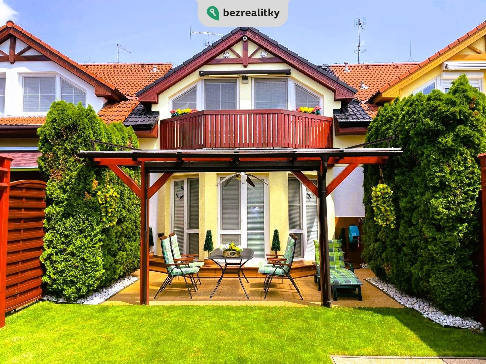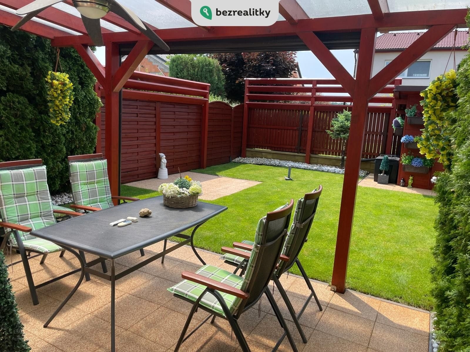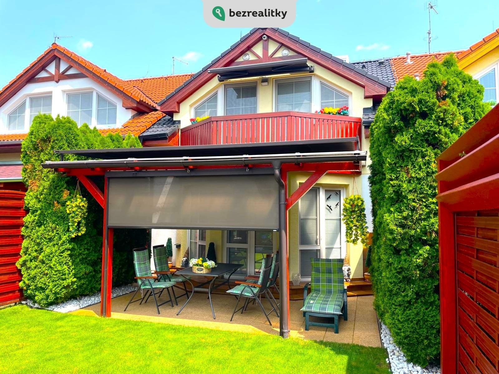 Zahrada: terasa, krytá zahradní pergolou z masivu a udržovanou zahradou, poskytující i v řadové zástavbě dostatek soukromí a klidu. Jižní strana s nadbytkem letního slunce má kompletní stínící techniku (nad pergolou je elektricky ovládaná markýza 6x4m a screenová roleta pro dostatečné stínění při slunečných dnech). Plně vybavený zahradní domek pro údržbu zahrady, rozvod odpadu, vody a elekro po zahradě,ohniště s krbem.