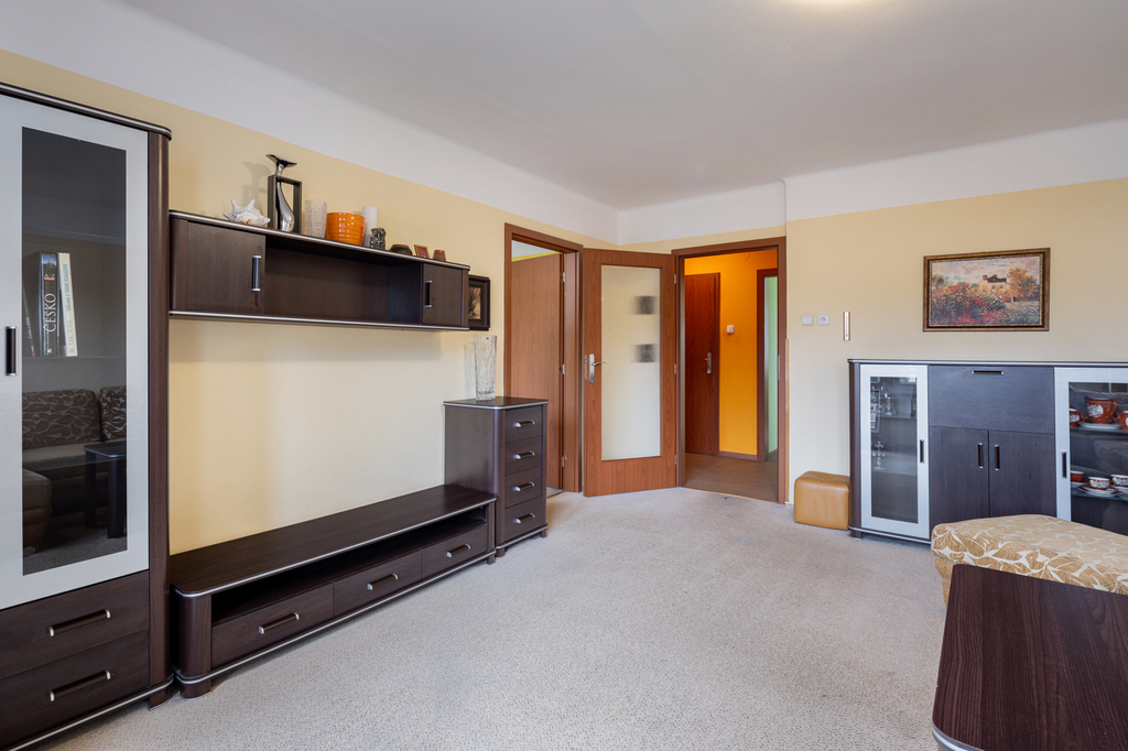 Obývací pokoj o výměře 21 m² je velmi prostorný, světlý a působí vzdušným dojmem. Z něj je vstup na nedávno zrekonstruovanou lodžii o velikosti 8,6 m² s příjemnou jihozápadní orientací. Z obývacího pokoje se dále vstupuje do ložnice o výměře 13 m².