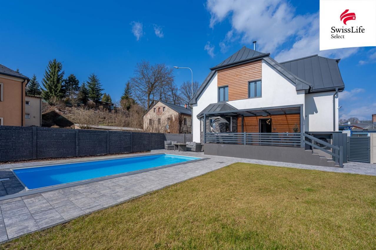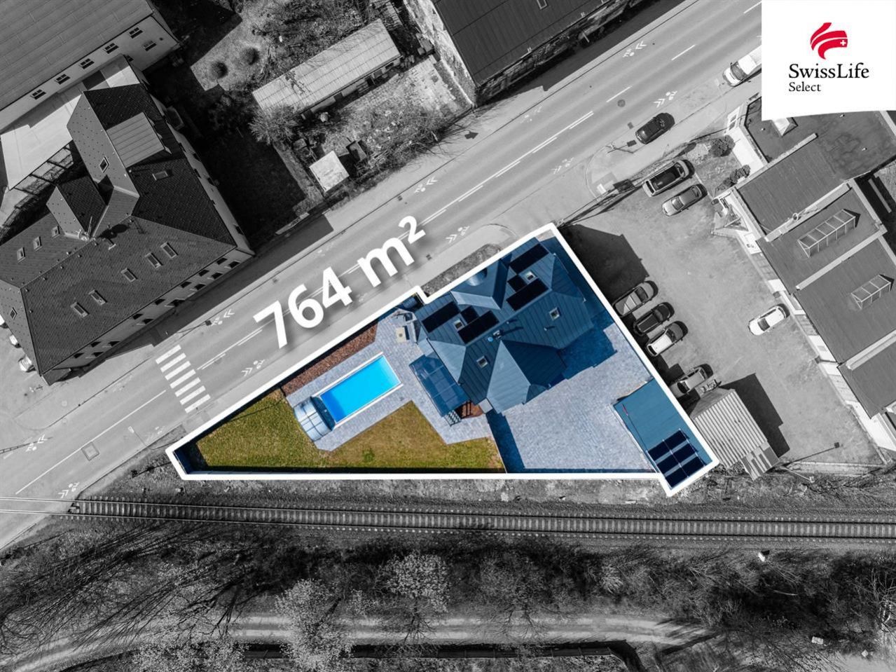 Na pozemku o výměře 764 m najdete prostornou garáž s nabíječkou pro elektromobil. Dominantou venkovního prostoru je vyhřívaný bazén se zastřešením a navazující terasa se vstupem na zahradu, která přímo vybízí k relaxaci a pohodovému trávení času.