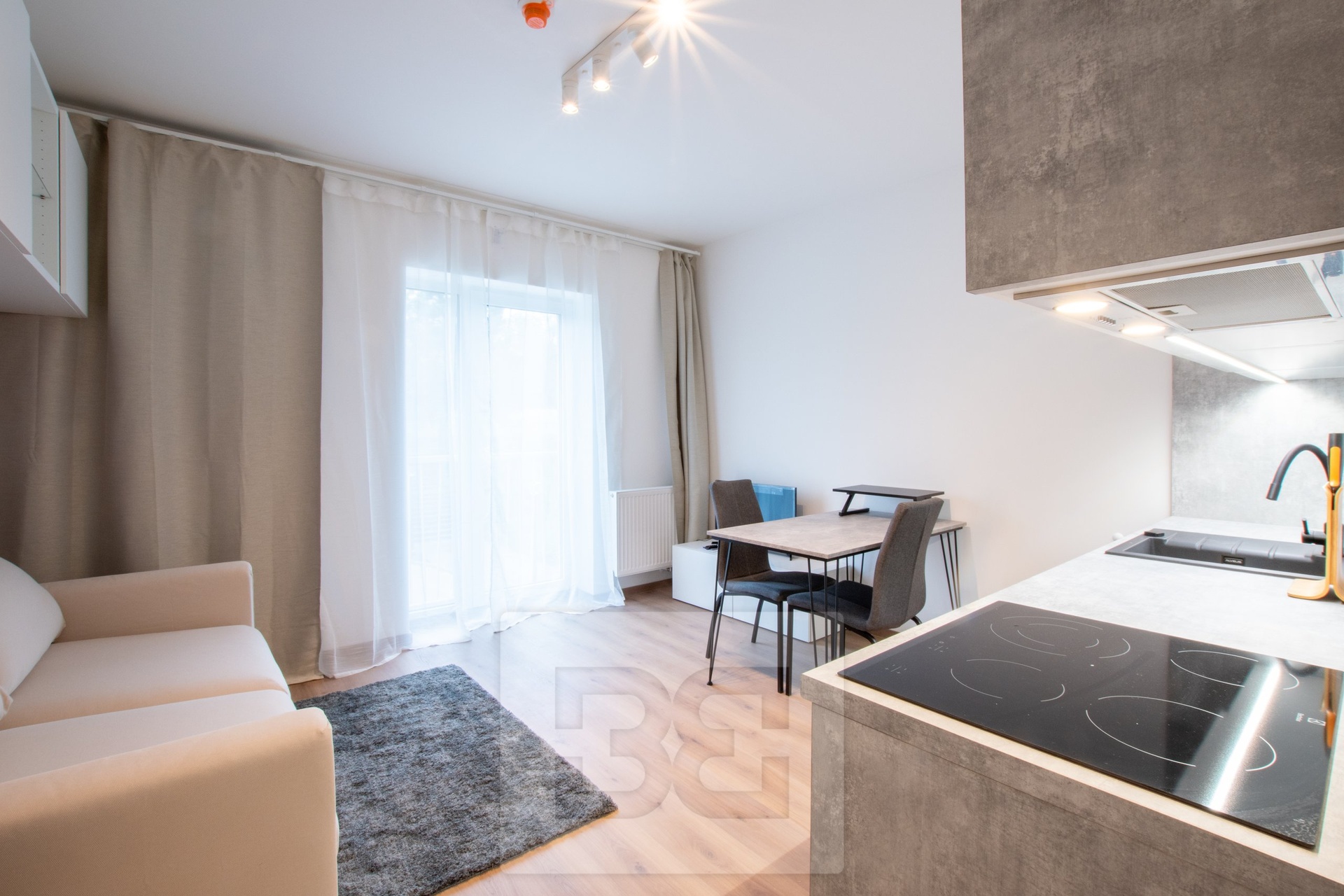 Nabízíme k pronájmu krásný, moderní byt o dispozici 1+kk a ploše 22 m², umístěný ve 2. nadzemním podlaží právě dokončené budovy v projektu Zelené údolí. Byt je kompletně vybaven – v kuchyňské části najdete moderní kuchyňskou linku se spotřebiči, mezi které patří lednice s mrazákem, indukční varná deska, trouba, digestoř a myčka. Obývací část je zařízena rozkládací pohovkou s matrací, vestavěnou skříní, jídelním stolem a televizí. Koupelna je vybavena sprchovým koutem, toaletou a pračkou. V předsíni je k dispozici další vestavěná šatní skříň.