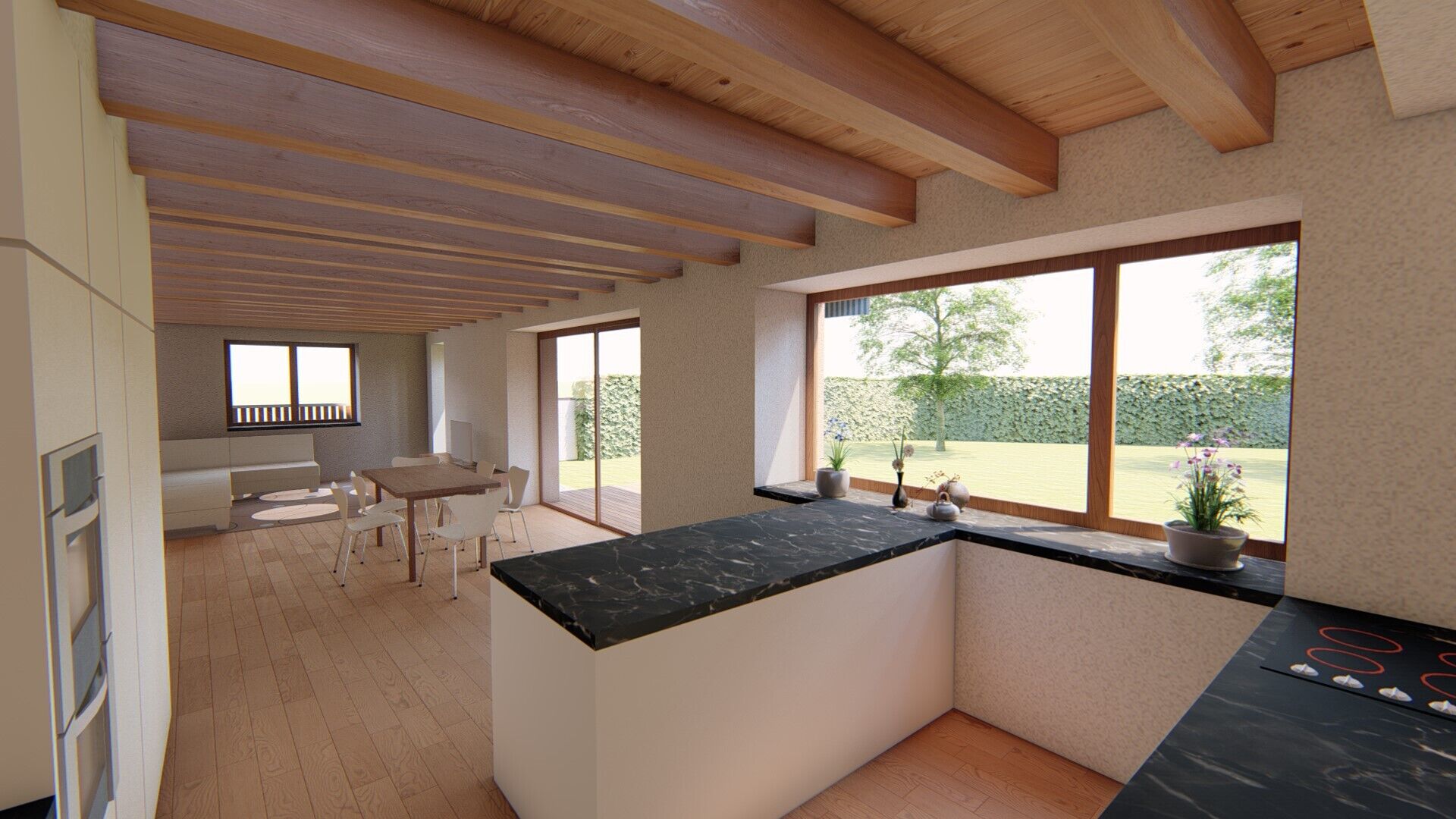 Dům poskytuje velkorysý prostor pro všechny členy rodiny. Všechny pokoje jsou neprůchozí. Dominantou je velký obytný prostor, obývací pokoj s kuchyní, se vstupem na terasu posuvnými prosklenými dveřmi o šíři 1,5 m. Celý prosklený otvor o šíři 3 m dopřává obytnému prostoru jak praktické propojení interiéru s terasou a zahradou, tak dostatek světla a slunečního osvitu. V podlaží se nachází klidová ložnicová zóna.