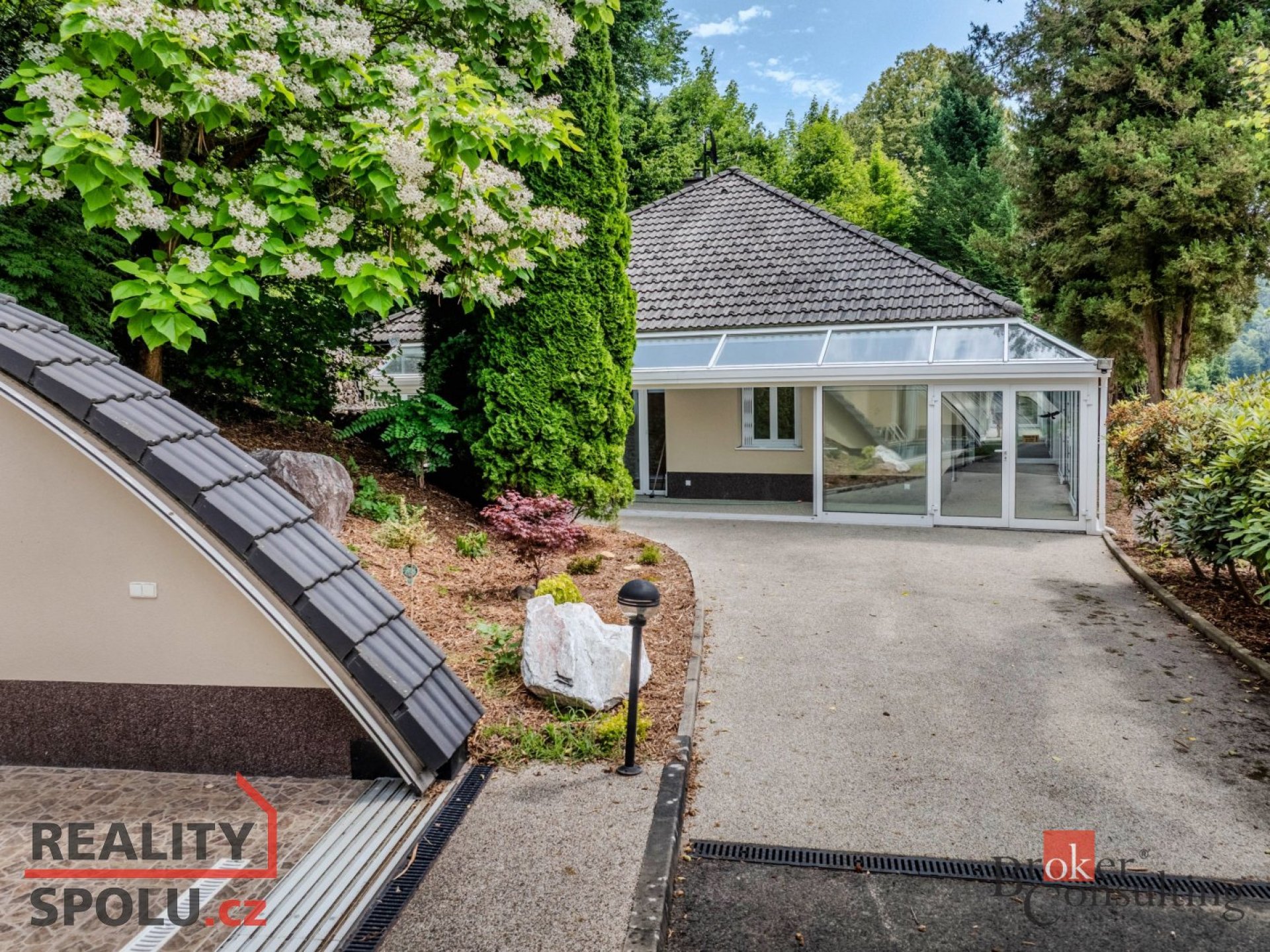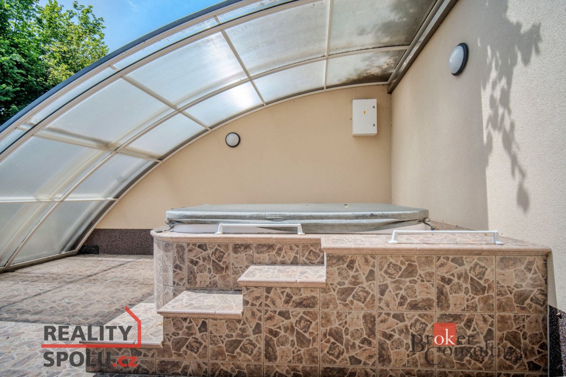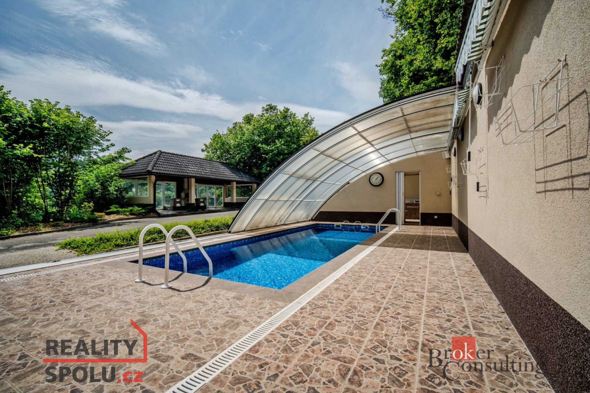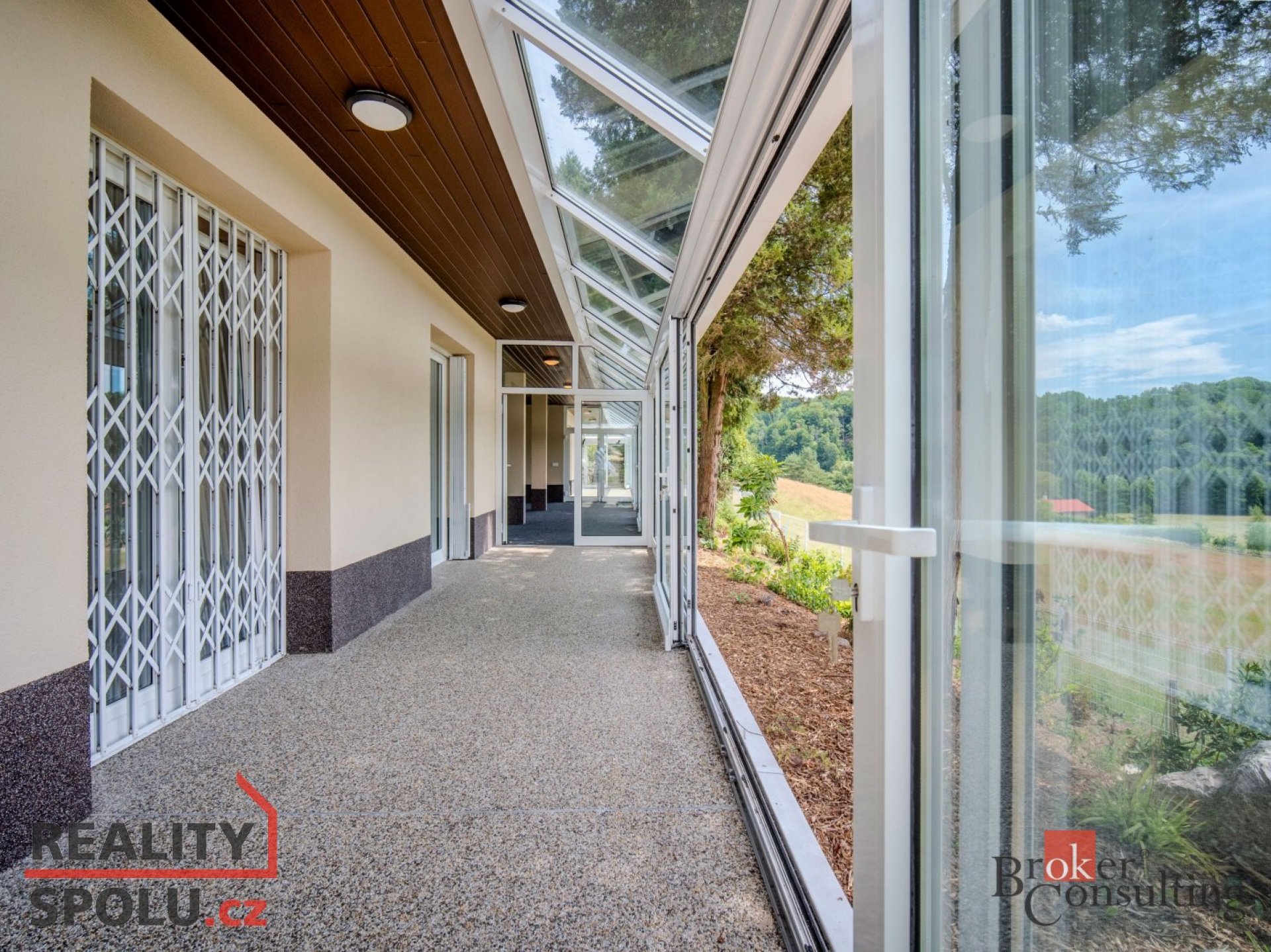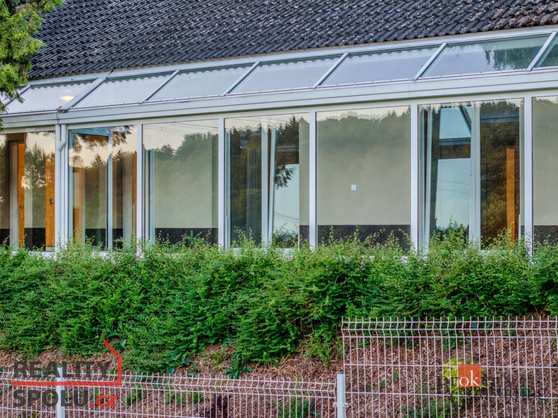 Kolem celého průčelí domu je zimní zahrada z hliníkových profilů a HS portálů. K domu vede vlastní příjezdová cesta ,parkování je vyřešeno pomocí tří parkovacích míst a tří garáží. K domu také patří přístavek s bazénem , vířivkou a sociálním zařízením a pergola s venkovním krbem.