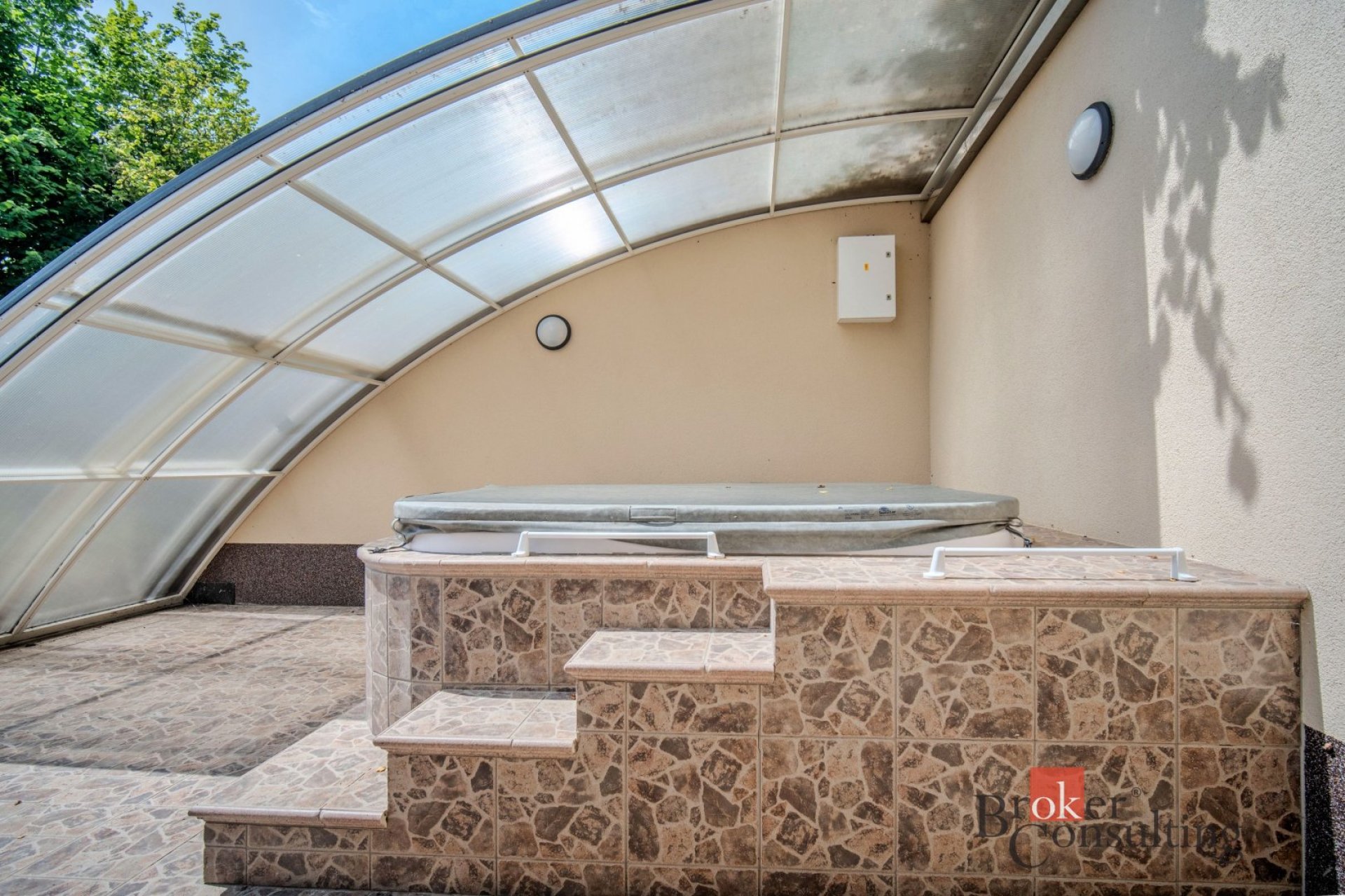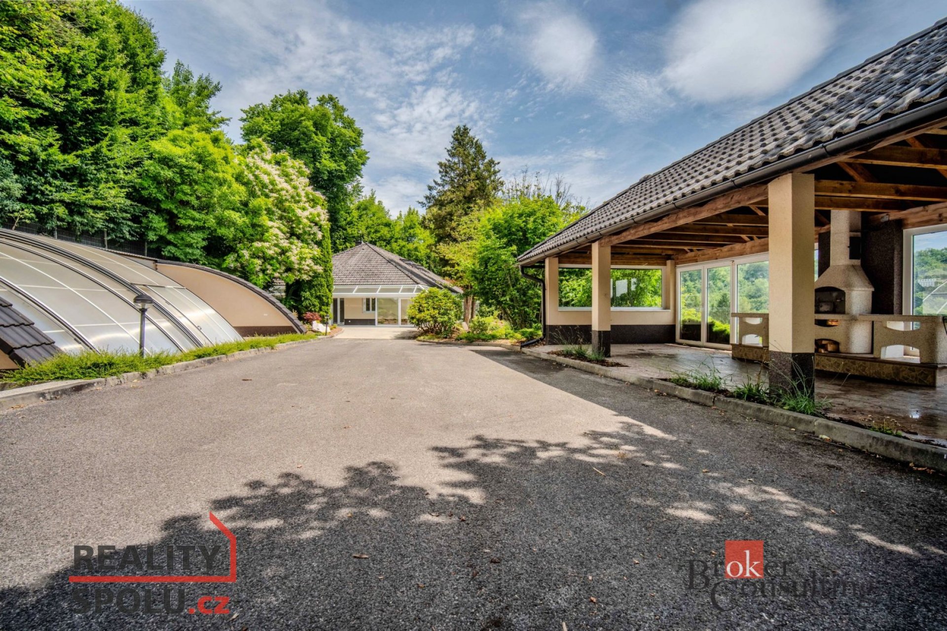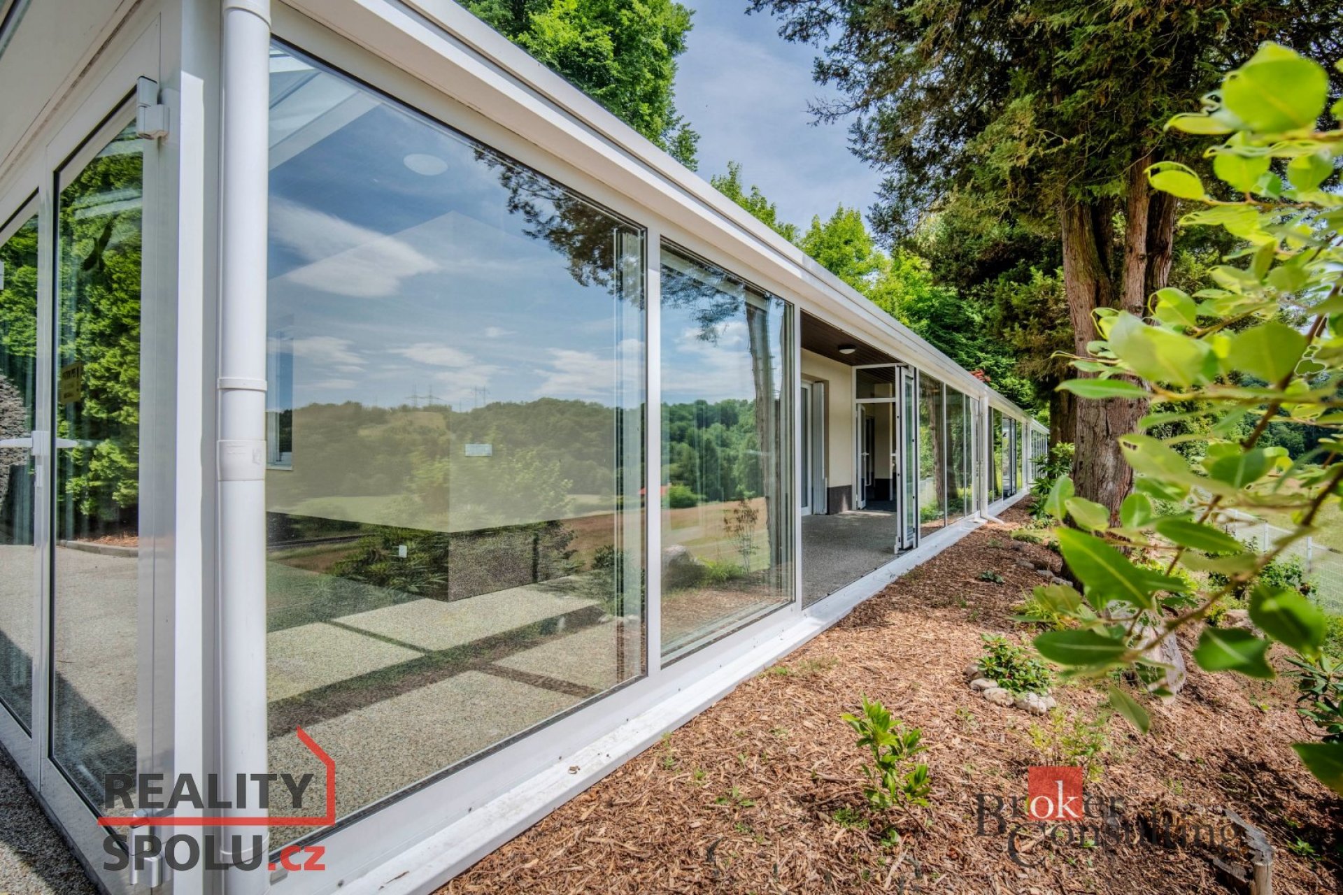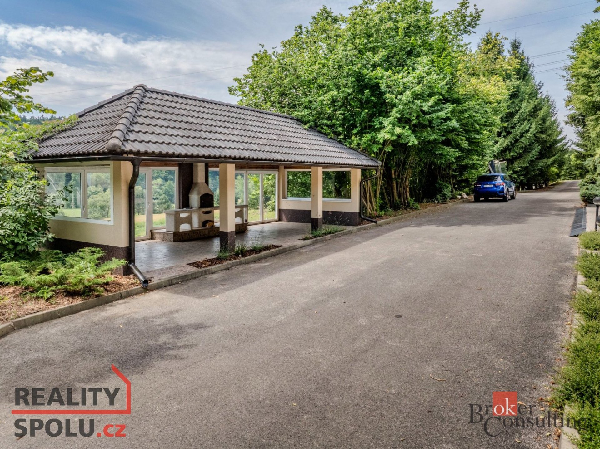 Kolem celého průčelí domu je zimní zahrada z hliníkových profilů a HS portálů. K domu vede vlastní příjezdová cesta ,parkování je vyřešeno pomocí tří parkovacích míst a tří garáží. K domu také patří přístavek s bazénem , vířivkou a sociálním zařízením a pergola s venkovním krbem.