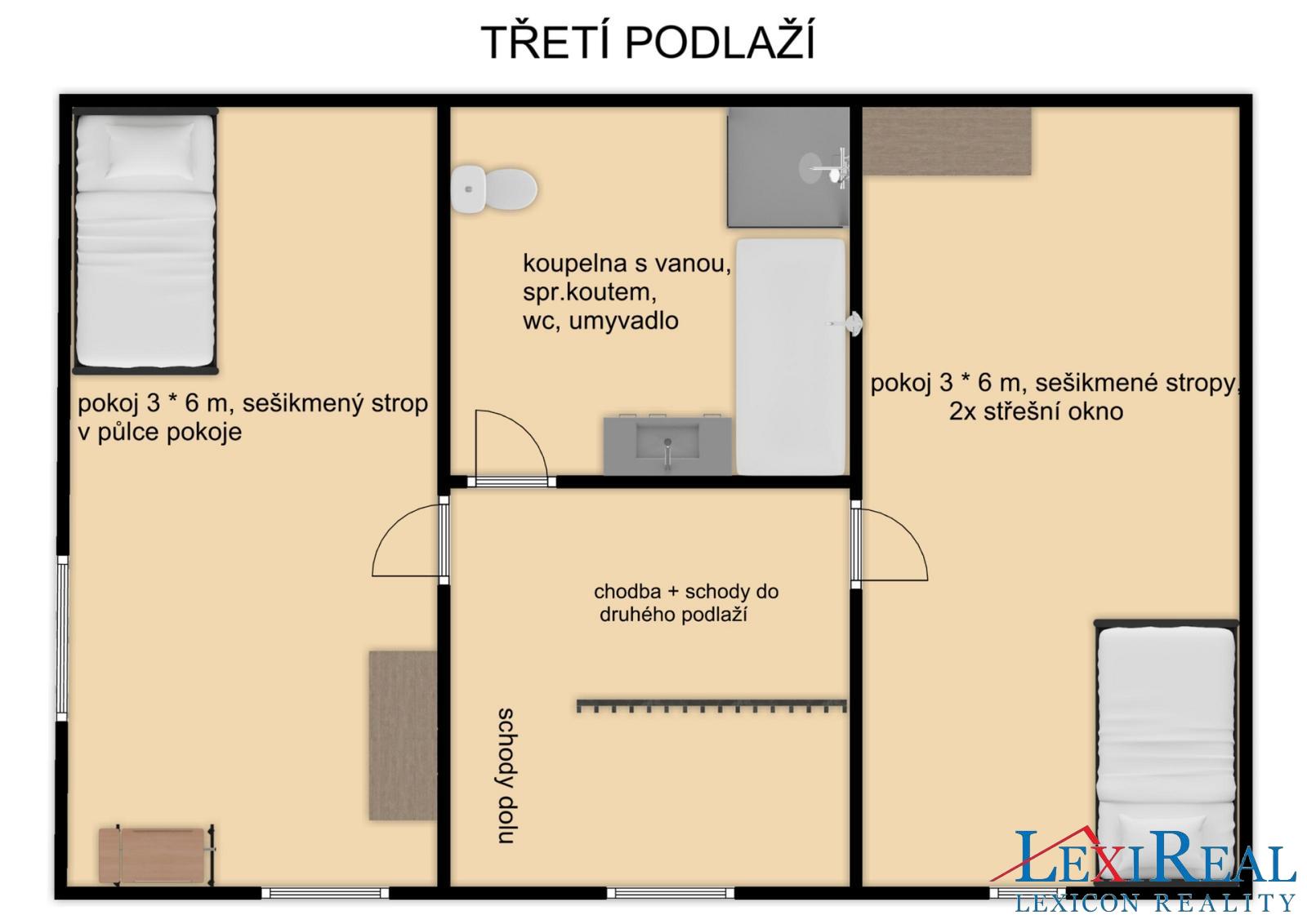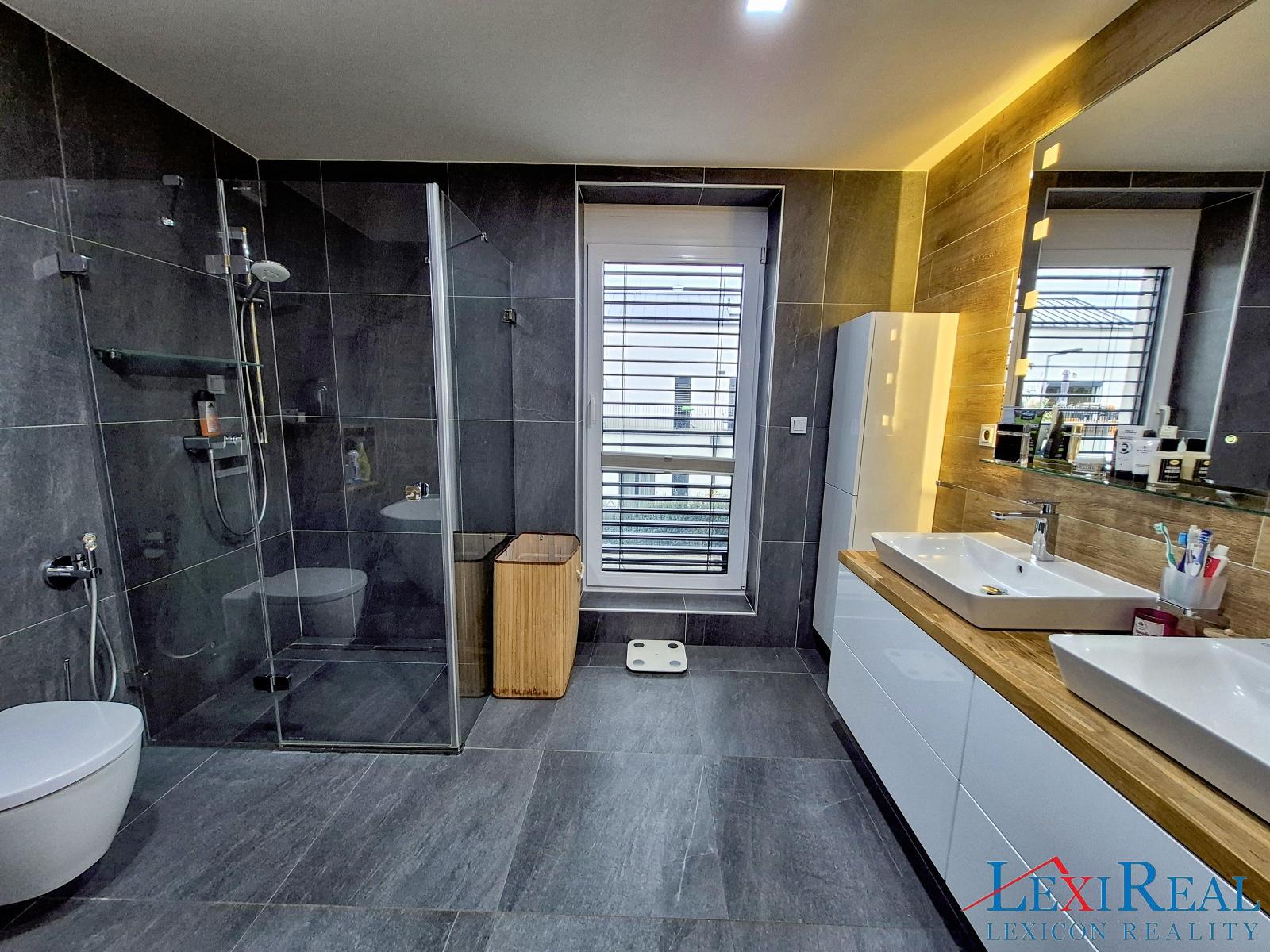 Další koupelna (vana + sprchový kout, WC ) a dva prostorné dětské pokoje nebo pokoje pro hosty / pracovny.