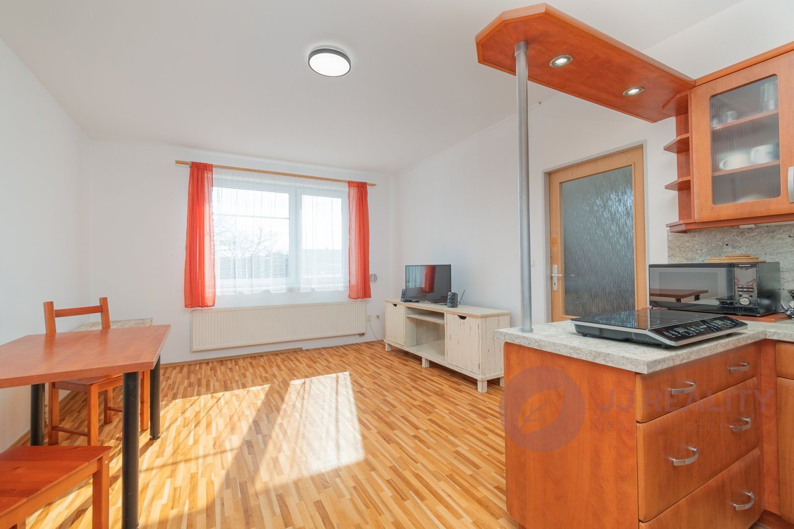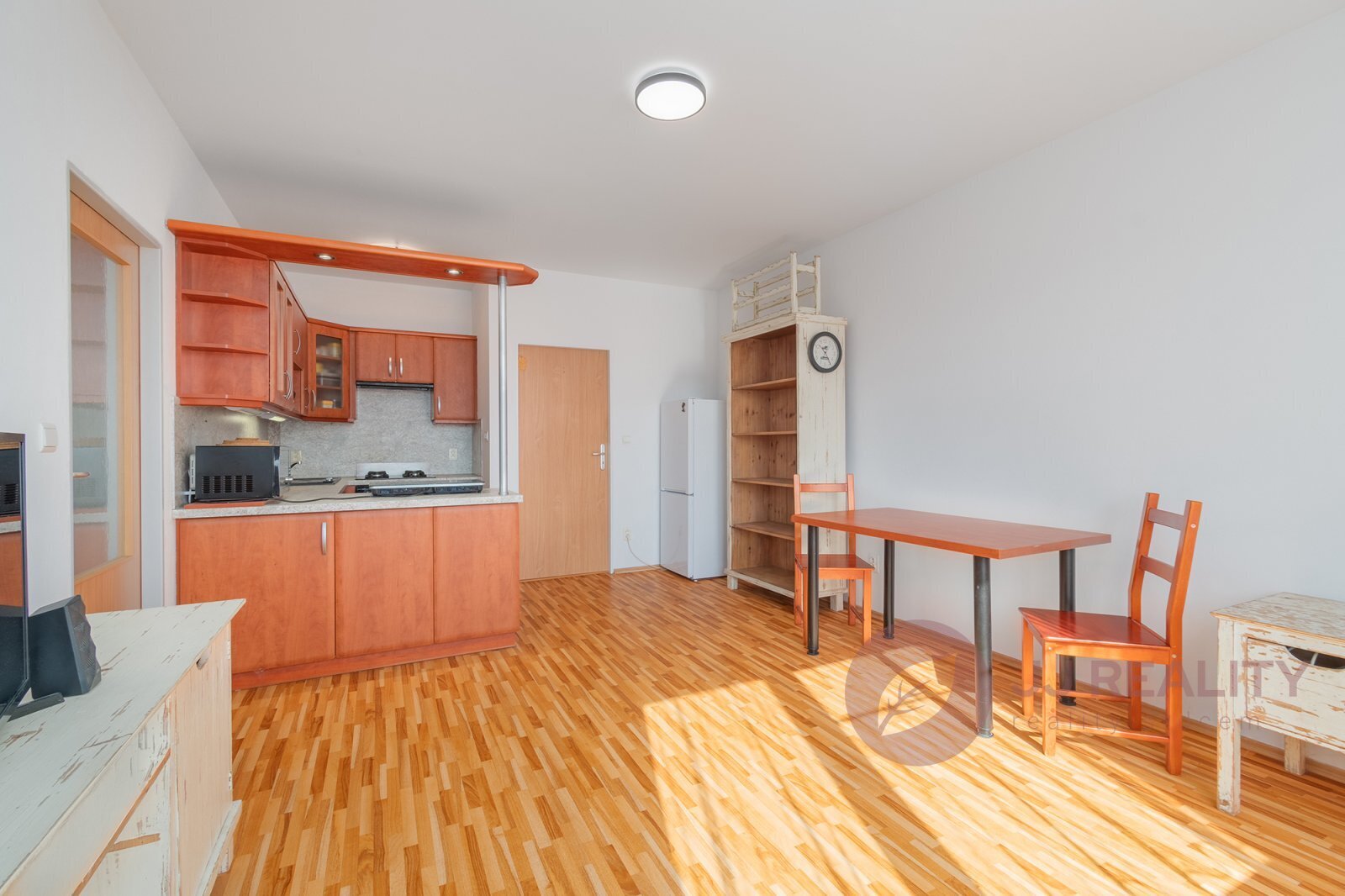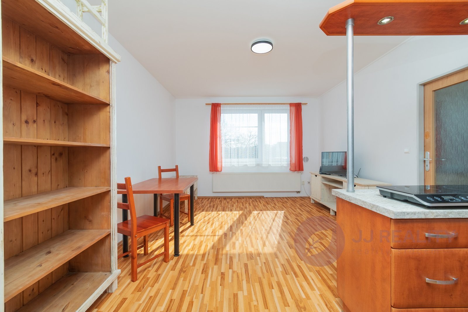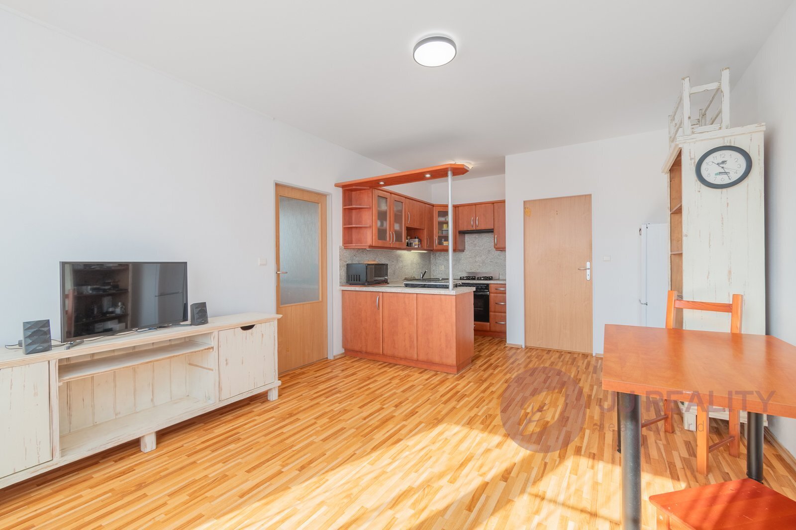 Srdcem bytu je otevřený obytný prostor s kuchyňským koutem, který je elegantně oddělen barovým pultem. Prostor působí harmonicky a přirozeně propojuje vaření, stolování i chvíle odpočinku. Za obývacím pokojem se nachází útulná ložnice,která má své osobité kouzlo – i přes zkosení jedné stěny zůstává dostatečně prostorná a působí velmi příjemně a klidně.