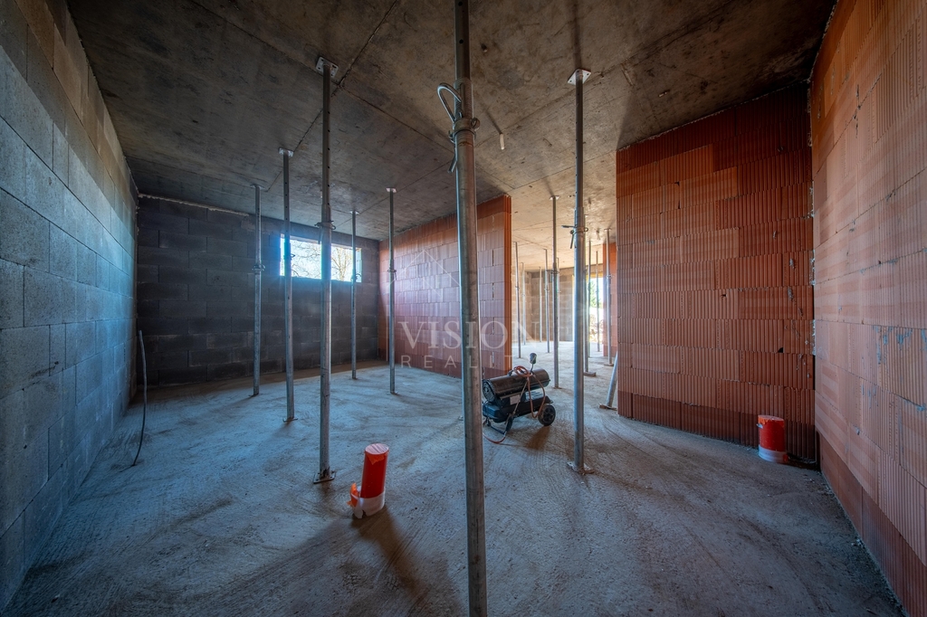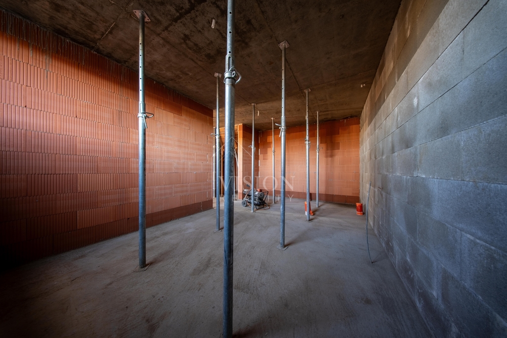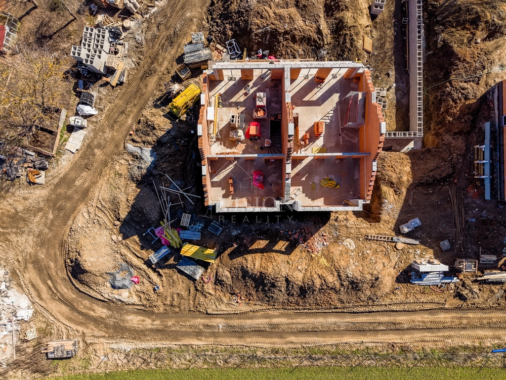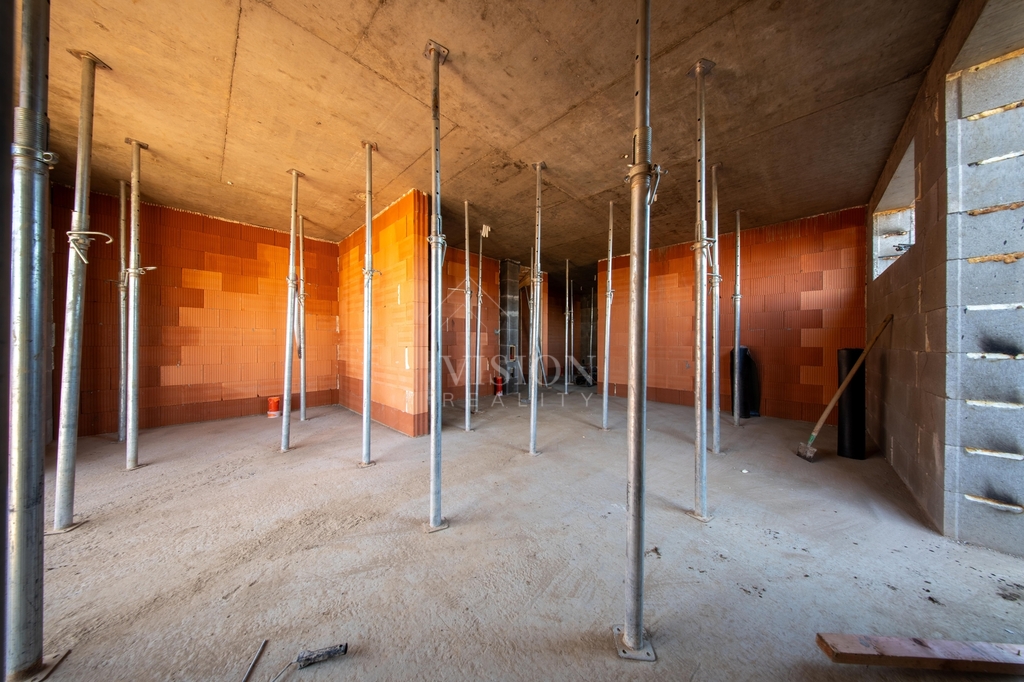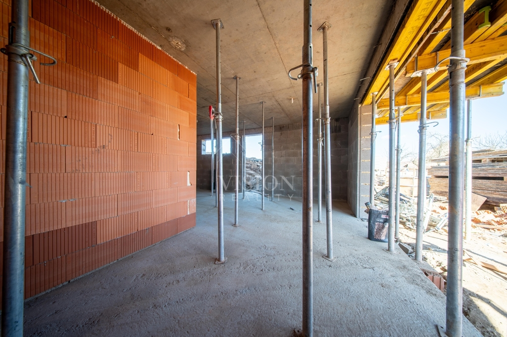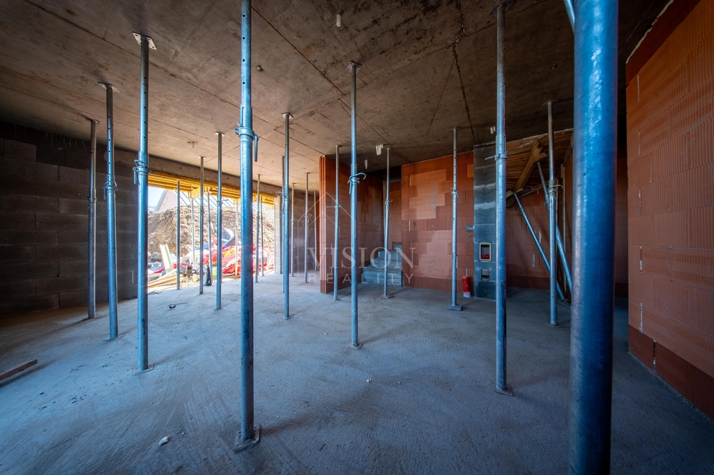 V prvním nadzemním podlaží je taktéž velký obývací prostor s kuchyní z něhož je přímý vstup na balkon. Dále je zde pracovna, samostatná toaleta a technická místnost.