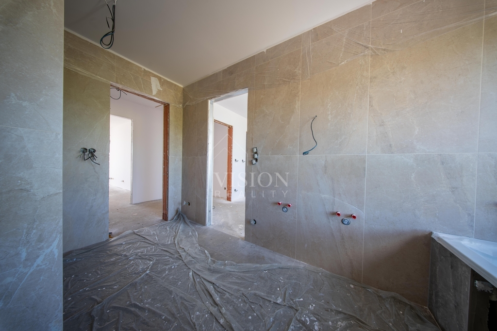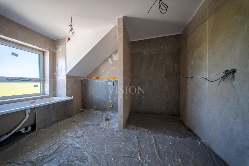 Dále se ve spodním patře nachází pracovna, koupelna s luxusní španělskou keramikou s nadčasovým designem doplněná o elegantní kamenické rohy, které prostoru dodávají exkluzivní a precizně zpracovaný detail, a technická místnost.