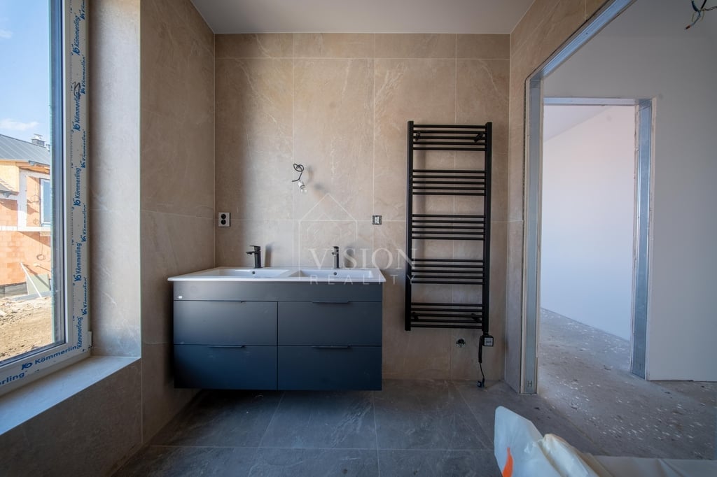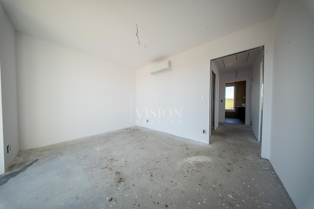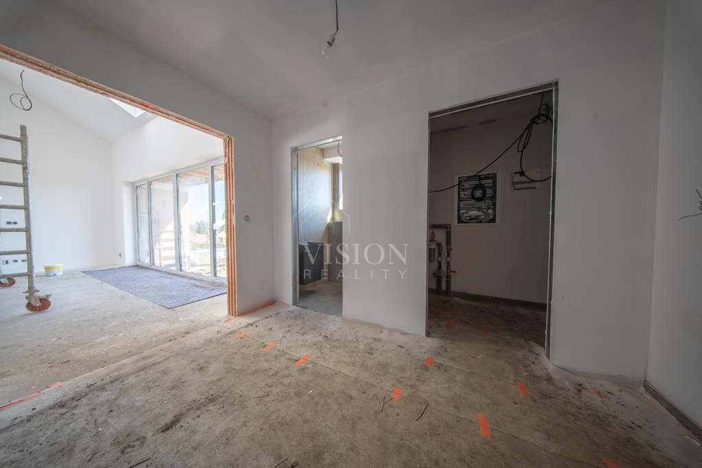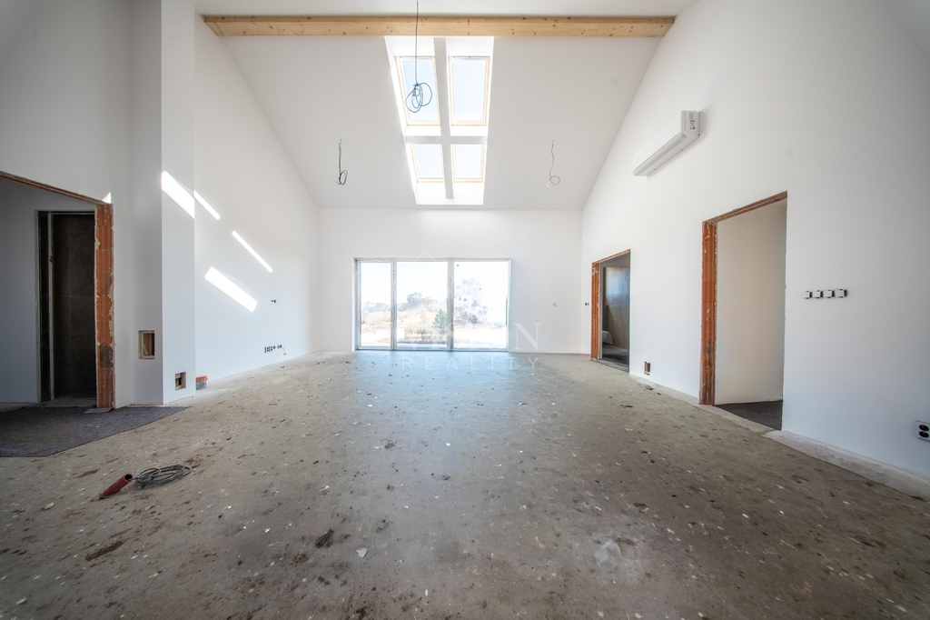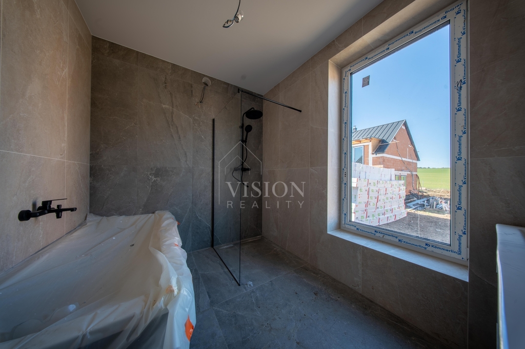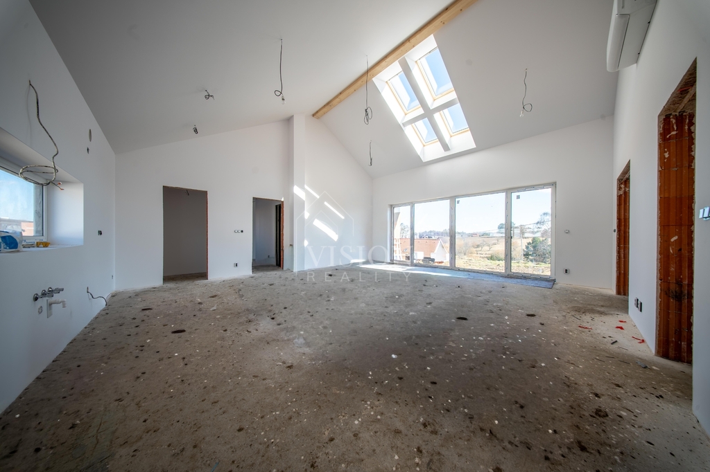 Dominantou domu je velkorysý obývací prostor s kuchyní, který je díky velkým oknům krásně prosvětlený a přirozeně propojený s terasou a zahradou. Pro naprostý komfort je zde ložnice s vlastní koupelnou a šatnou. Dále jsou zde dva samostatné pokoje, které mají taktéž každý svou šatnu.V domě nechybí ani pracovna a další velká koupelna rovněž s luxusní španělskou keramikou s nadčasovým designem. Pro praktičnost domu jsou zde další dvě samostatné toalety a technická místnost.