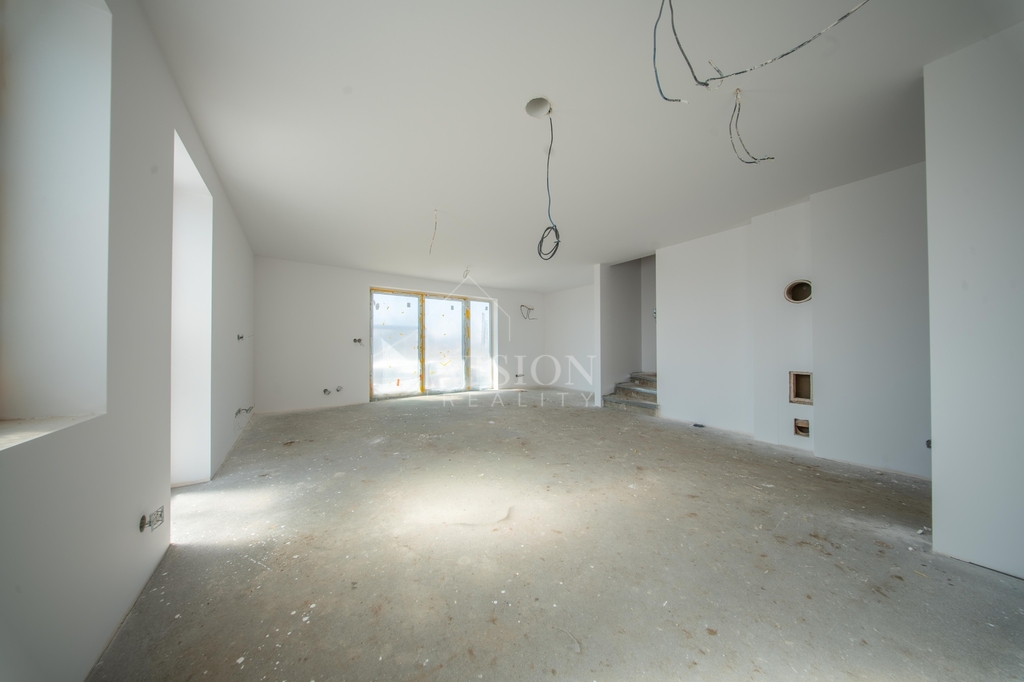 Dominantou domu je velkorysý obývací pokoj s kuchyní, který je díky velkým oknům krásně prosvětlený a přirozeně propojený s terasou a zahradou.