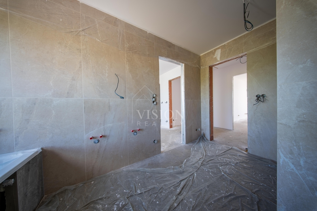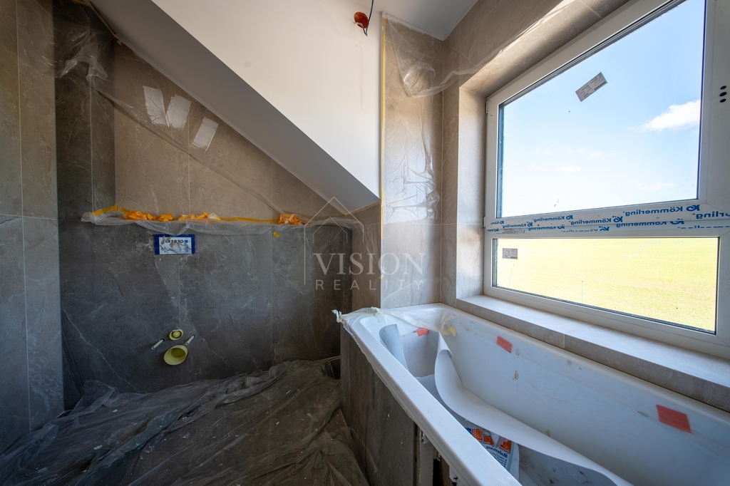 Dále se ve spodním patře nachází pracovna, koupelna s luxusní španělskou keramikou s nadčasovým designem doplněná o elegantní kamenické rohy, které prostoru dodávají exkluzivní a precizně zpracovaný detail, a technická místnost.