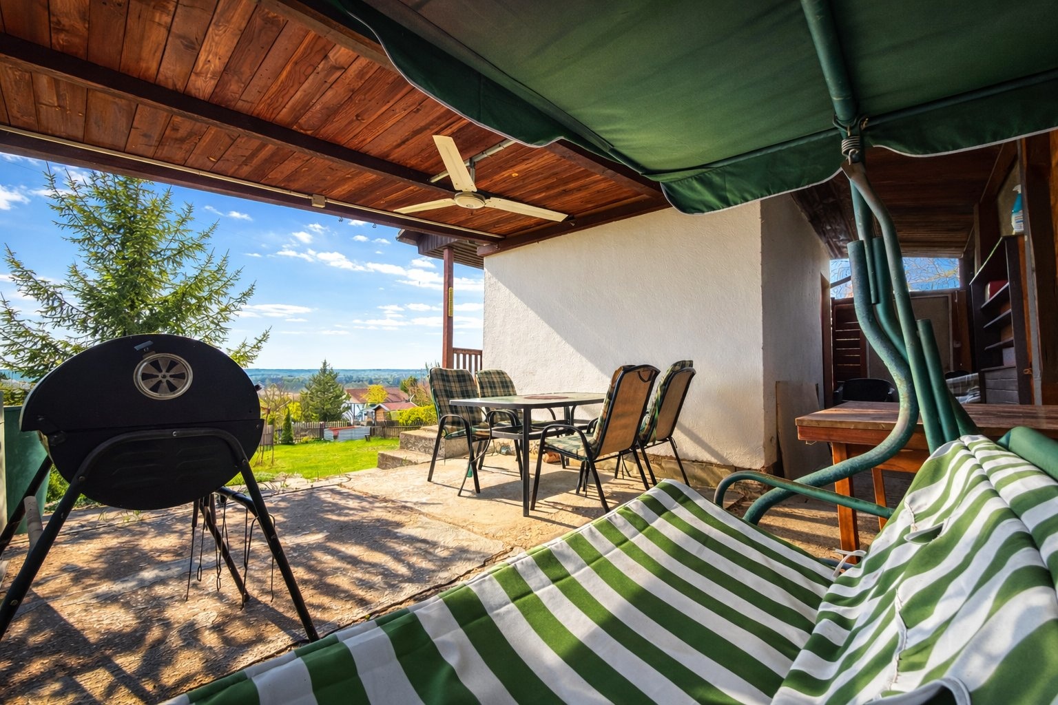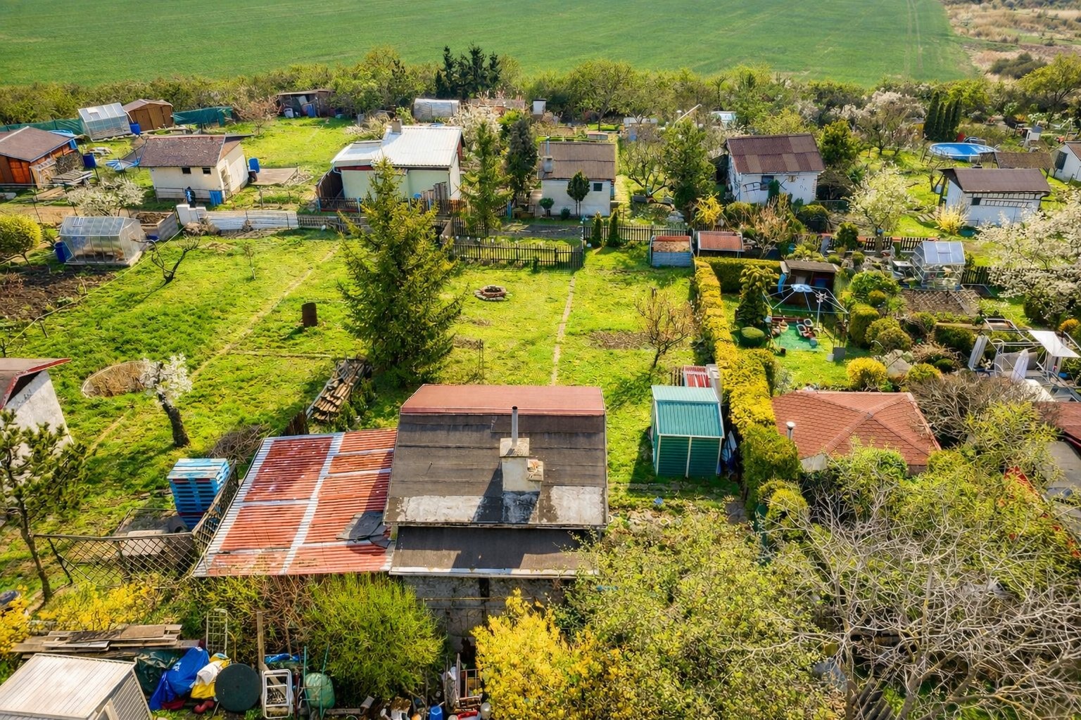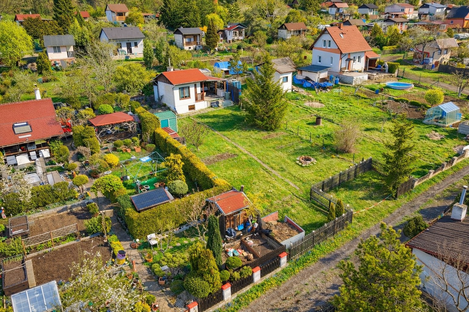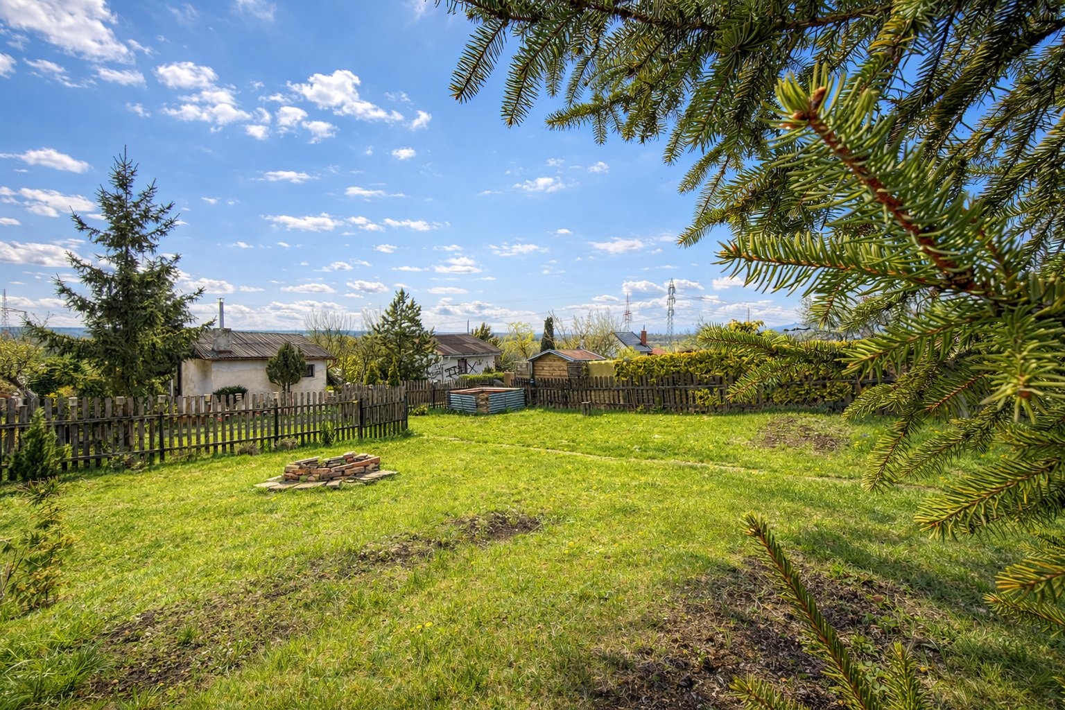 Pozemek je celý oplocený, nachází se na slunném svahu a během dne je zde opravdu dostatek slunce. Vedle chatky najdete zastřešené posezení, z druhé strany pak WC (chemické). K dispozici je také ohniště, plechová kůlna na nářadí a kompost.