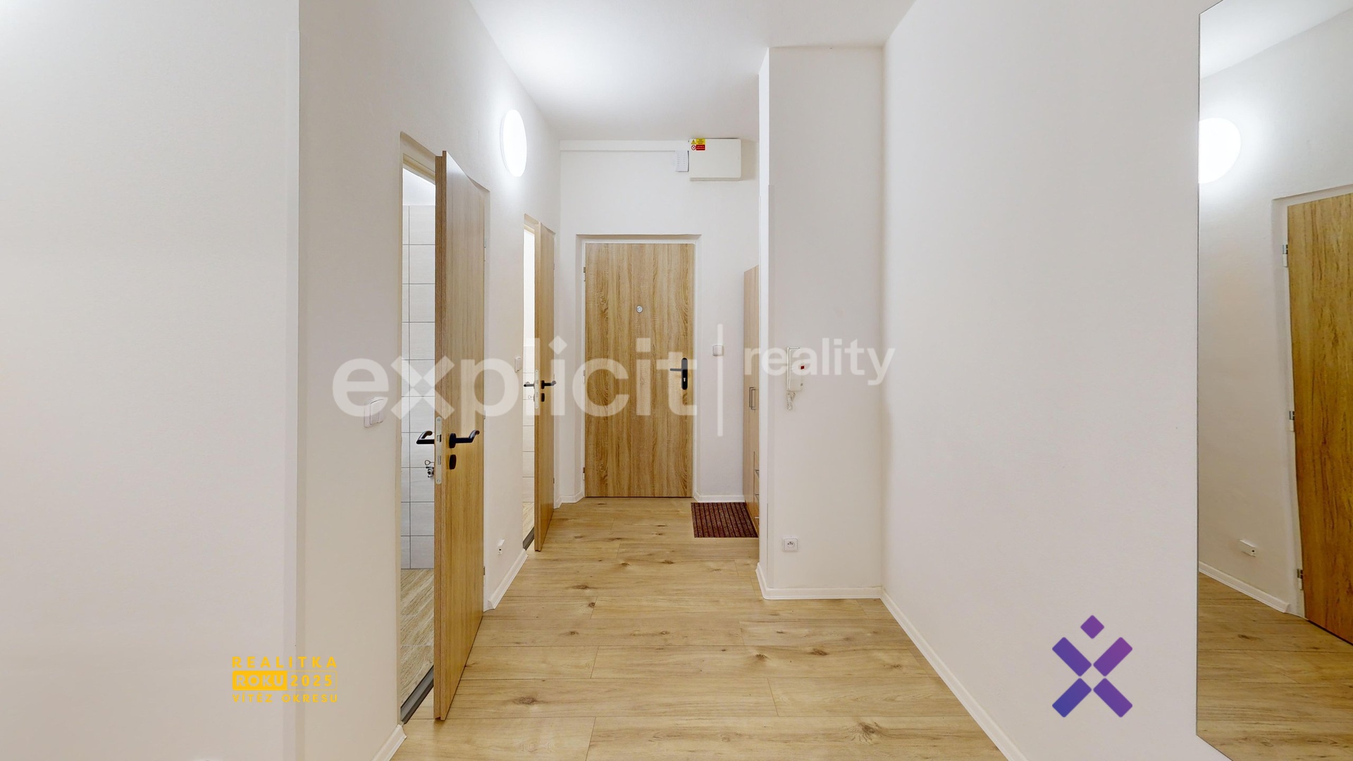 Byt má praktické dispoziční řešení. Po vstupu se po pravé straně nachází koupelna a samostatné WC, po levé straně vestavná skříň poskytující základní úložný prostor. Z chodby je vstup do všech místností bytu.