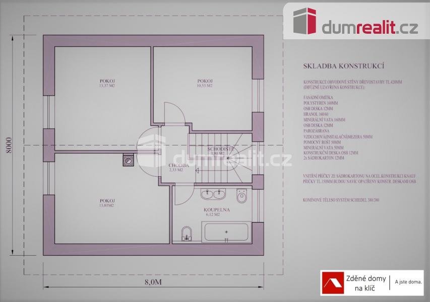 Naše společnost Vám zprostředkuje výstavbu patrového domu Klára v provedení zděná stavba na klíč s dispozicí 5+kk o užitné ploše 93 m² a zastavené ploše 64 m². Výstavbu provedeme na Vašem pozemku - není součástí ceny. Zdarma prověříme, zda lze tento dům na vašem pozemku postavit, prověříme i dostupnost sítí a územní plán. V projektu jsou možné variabilní úpravy dispozice (posuny příček či oken). Jedná se o patrový dům, ideální až pro 5 člennou rodinu s nízkými provozními náklady. Uvedená cena je za kompletní výstavbu domu na klíč, včetně DPH, projektové dokumentace, vyřízení stavebního povolení, základové desky až po kolaudaci. V uvedené ceně můžete počítat s finálními povrchovými úpravami exteriéru i interiéru, a to včetně elektroinstalací, sanitárního vybavení s bateriemi, interiérovými dveřmi včetně obložek, vytápění je řešeno teplovodním podlahovým topením v kombinaci tepelného čerpadla se 180L zásobníkem na teplou vodu. Za příplatek změníme systém vytápění nebo vystavíme komín pro krbové kamna nebo pro využití krbové vložky. Garáž spojená s domem, za příplatek. Pro náročnější klienty máme nabídku nadstandardního vybavení chytré domácnosti, klimatizaci, externí žaluzie a rolety a další. Doba výstavby cca 14 měsíců od vydání stavebního povolení a stavbu zahájíme do 10 dnů od jeho vydání. Smlouvy o dílo zašleme na vyžádání včetně vzorového položkového rozpočtu. Tento typový dům Vám rádi ukážeme v rozpracovaném stavu nebo hotovém, kde se seznámíte se skladbou materiálů a můžete si tak projít dispozice domu. Podrobnější informace, včetně změny stavebního materiálu například na dřevostavbu, naleznete na webových stránkách naší firmy Zděné domky na klíč. Máte-li svůj projekt nebo jen nějakou představu, pošlete nám ji a my vám jej naceníme. Pomůžeme i s hledáním vhodného pozemku dle zaslaného zadání. Fotografie domů jsou domy, které jsme jednak realizovali, ale také vám je rádi ukážeme. Doporučuji prohlídku tohoto domu! Ev. číslo: 653436.
