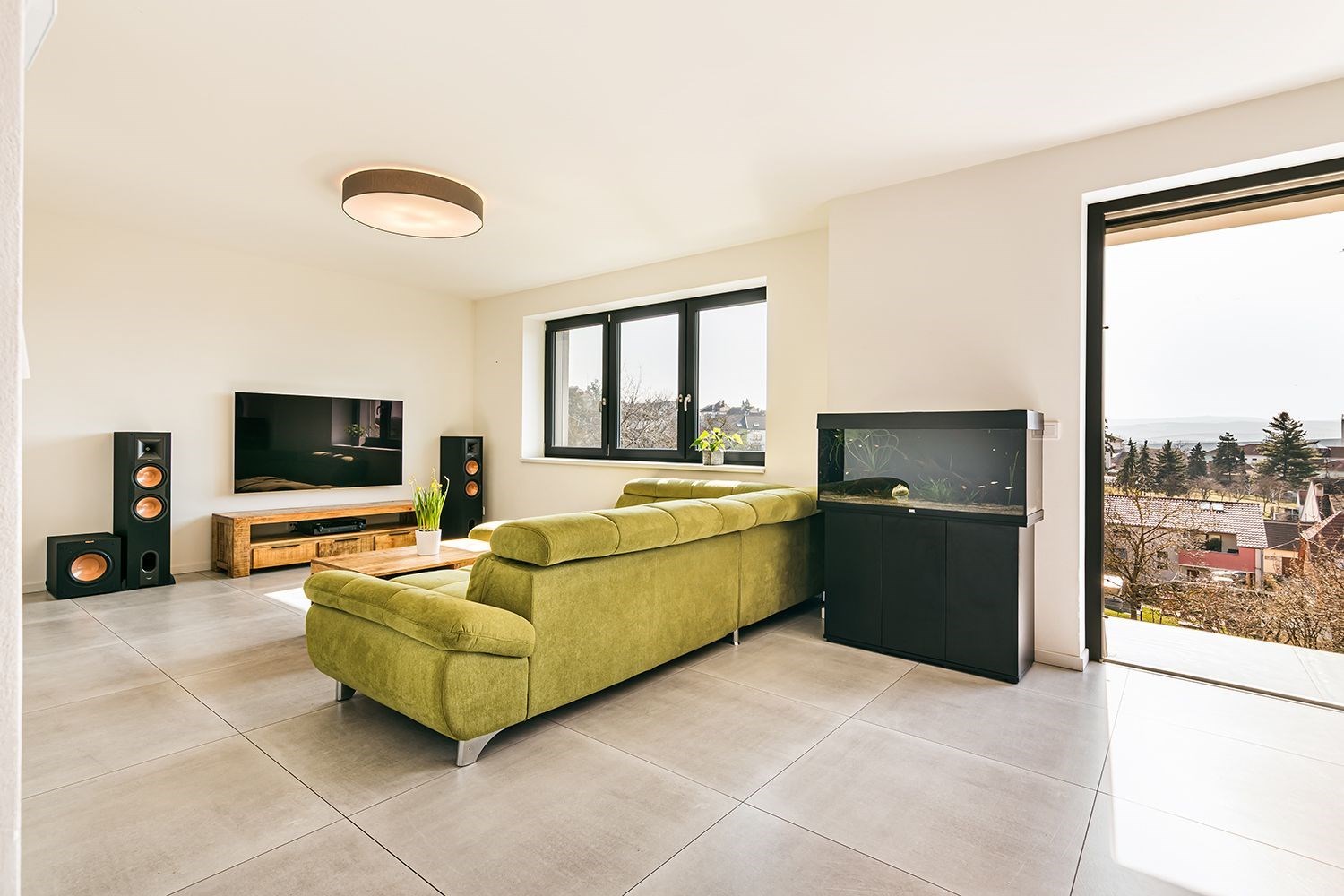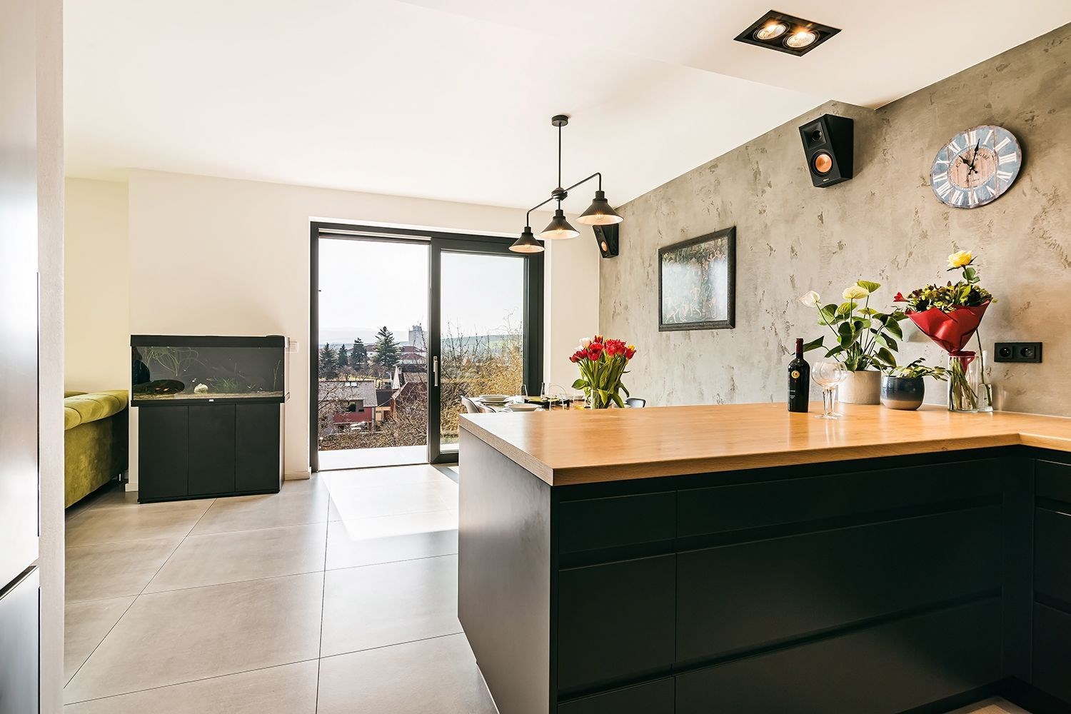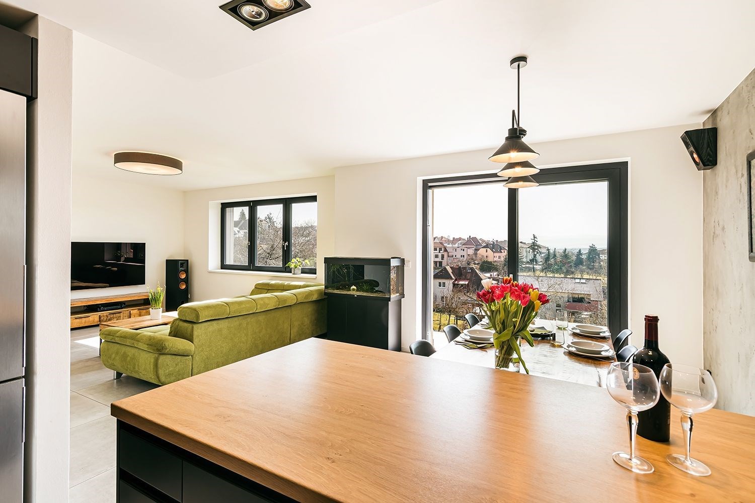 Hlavní obytná část se nachází ve druhém nadzemním podlaží. Obývací pokoj je zde propojen s kuchyní a jídelnou, čímž vzniká otevřený a vzdušný prostor pro společné chvíle s rodinou i přáteli. Dominantou je značková kuchyňská linka na míru v moderním designu. A když si ráno připravíte kávu nebo večer usednete ke krbu, otevře se před vámi nádherný výhled do krajiny až na Velkou Javořinu. Právě tento výhled dává domu jedinečnou atmosféru a pocit propojení domova s přírodou.