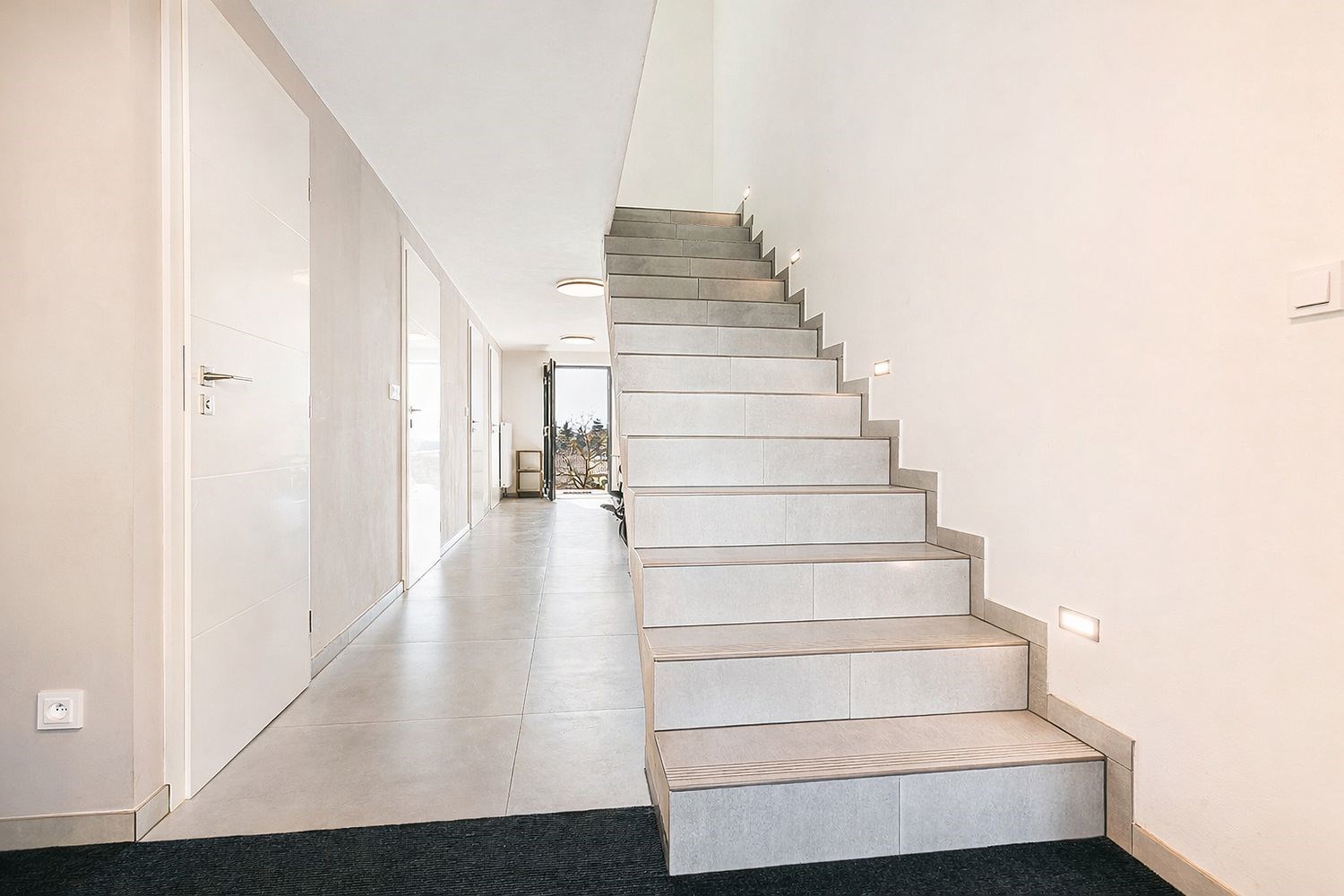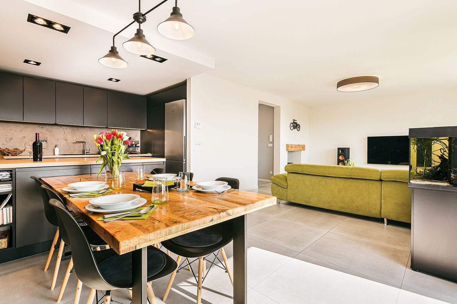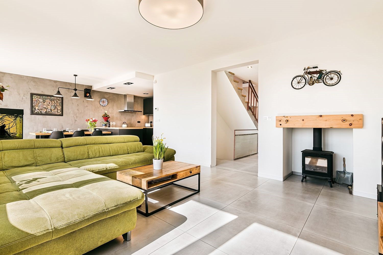 Hlavní obytná část se nachází ve druhém nadzemním podlaží. Obývací pokoj je zde propojen s kuchyní a jídelnou, čímž vzniká otevřený a vzdušný prostor pro společné chvíle s rodinou i přáteli. Dominantou je značková kuchyňská linka na míru v moderním designu. A když si ráno připravíte kávu nebo večer usednete ke krbu, otevře se před vámi nádherný výhled do krajiny až na Velkou Javořinu. Právě tento výhled dává domu jedinečnou atmosféru a pocit propojení domova s přírodou.