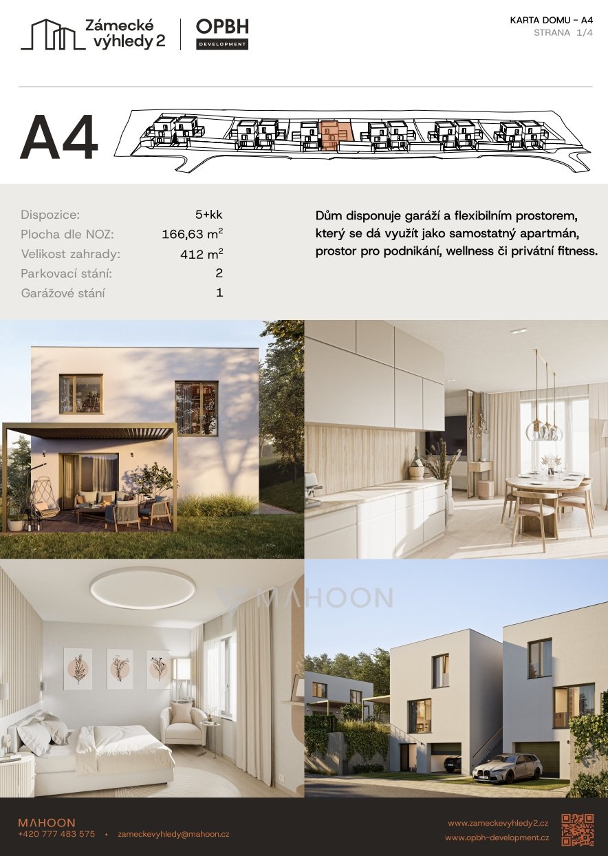 Nabízíme k prodeji moderní bytovou jednotku č. A4 o dispozici 5+KK a podlahové ploše 153,5 m² se zahradou 412 m², která se nachází v projektu Zámecké výhledy II v obci Úholičky.