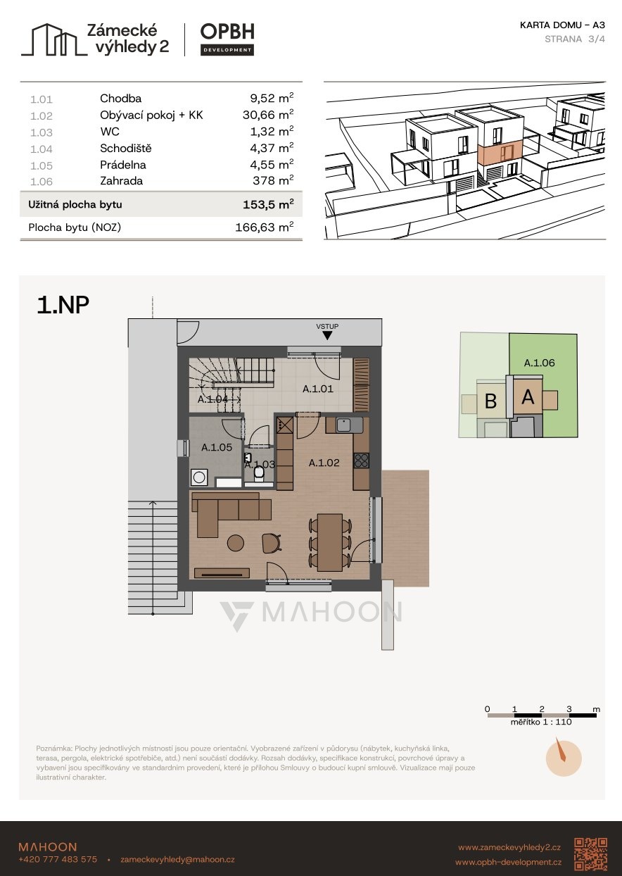 Nabízíme k prodeji moderní bytovou jednotku č. A3 o dispozici 5+KK a podlahové ploše 153,5 m² se zahradou 378 m², která se nachází v projektu Zámecké výhledy II v obci Úholičky.