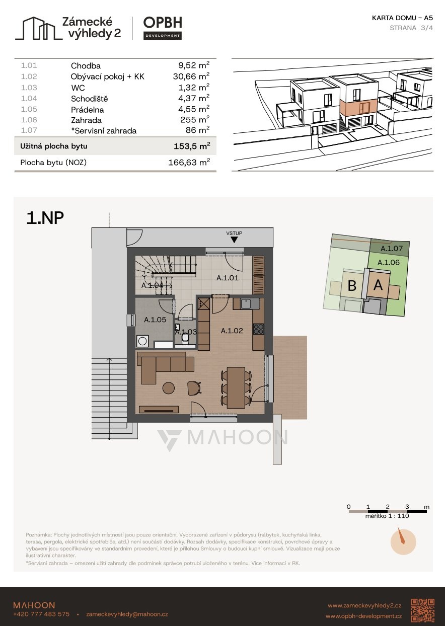 Nabízíme k prodeji moderní bytovou jednotku č. A5 o dispozici 5+KK a podlahové ploše 153,5 m² se zahradou 341 m², která se nachází v projektu Zámecké výhledy II v obci Úholičky.