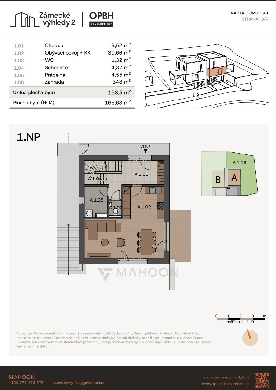 Nabízíme k prodeji moderní bytovou jednotku č. A1 o dispozici 5+KK a podlahové ploše 153,5 m² se zahradou 348 m², která se nachází v projektu Zámecké výhledy II v obci Úholičky.