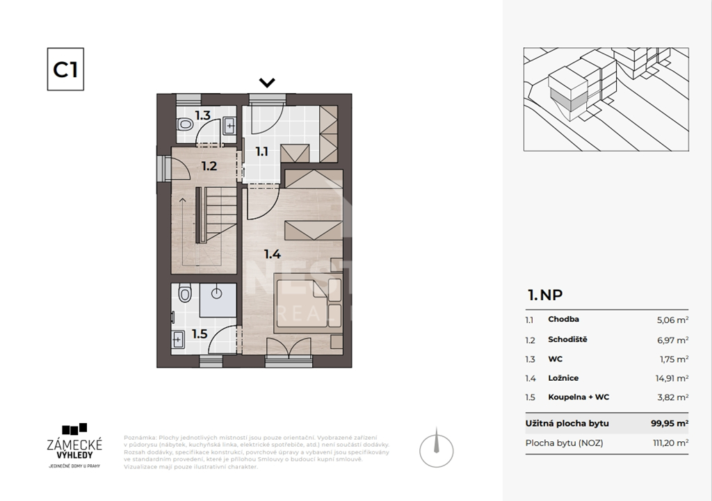 1. NP – ložnice (14,91 m2), koupelna + WC (3,82 m2), WC (1,75 m2), chodba (5,06 m2), schodiště (6,97 m2)