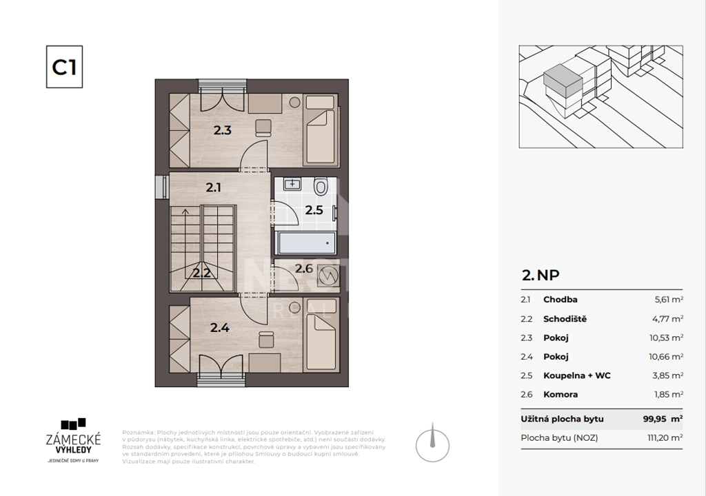 2. NP - ložnice (10,66 m2), ložnice (10,53 m2), koupelna + WC (3,85 m2), komora (1,85 m2), chodba (5,61 m2), schodiště (4,77 m2)