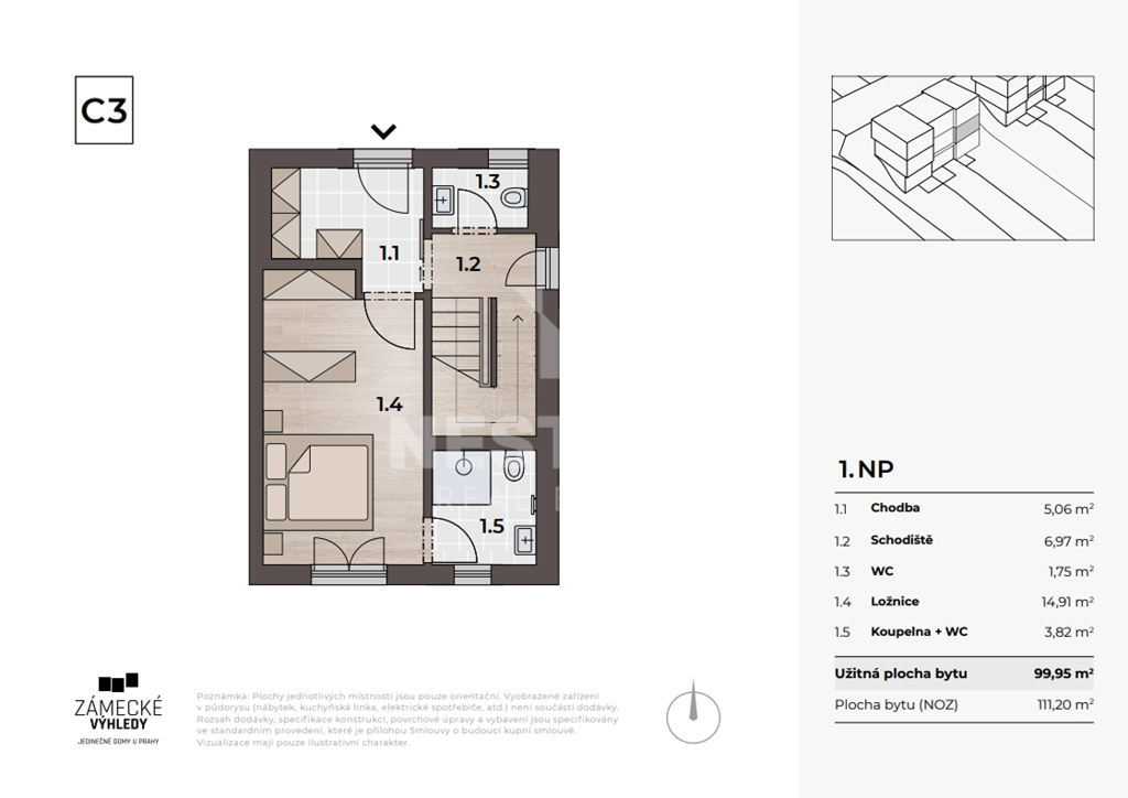 1. NP – ložnice (14,91 m2), koupelna + WC (3,82 m2), WC (1,75 m2), chodba (5,06 m2), schodiště (6,97 m2)